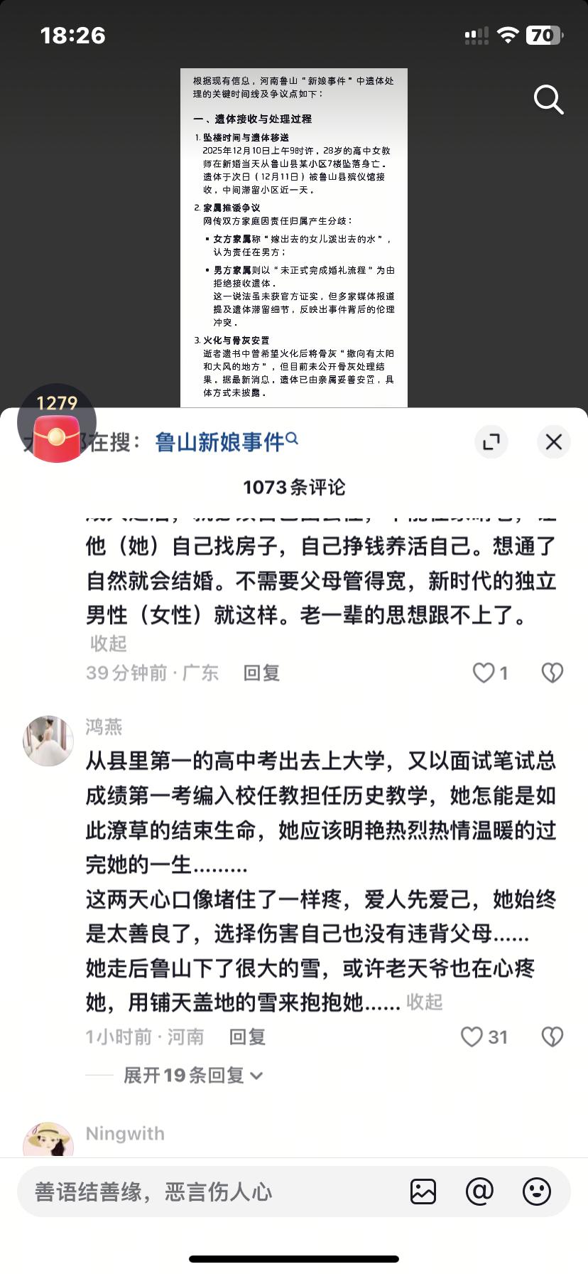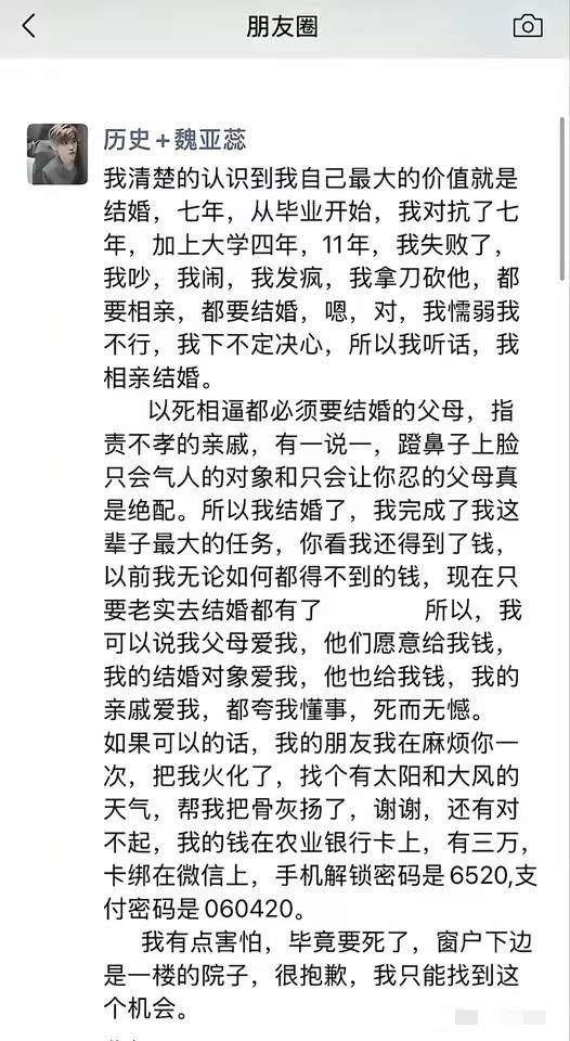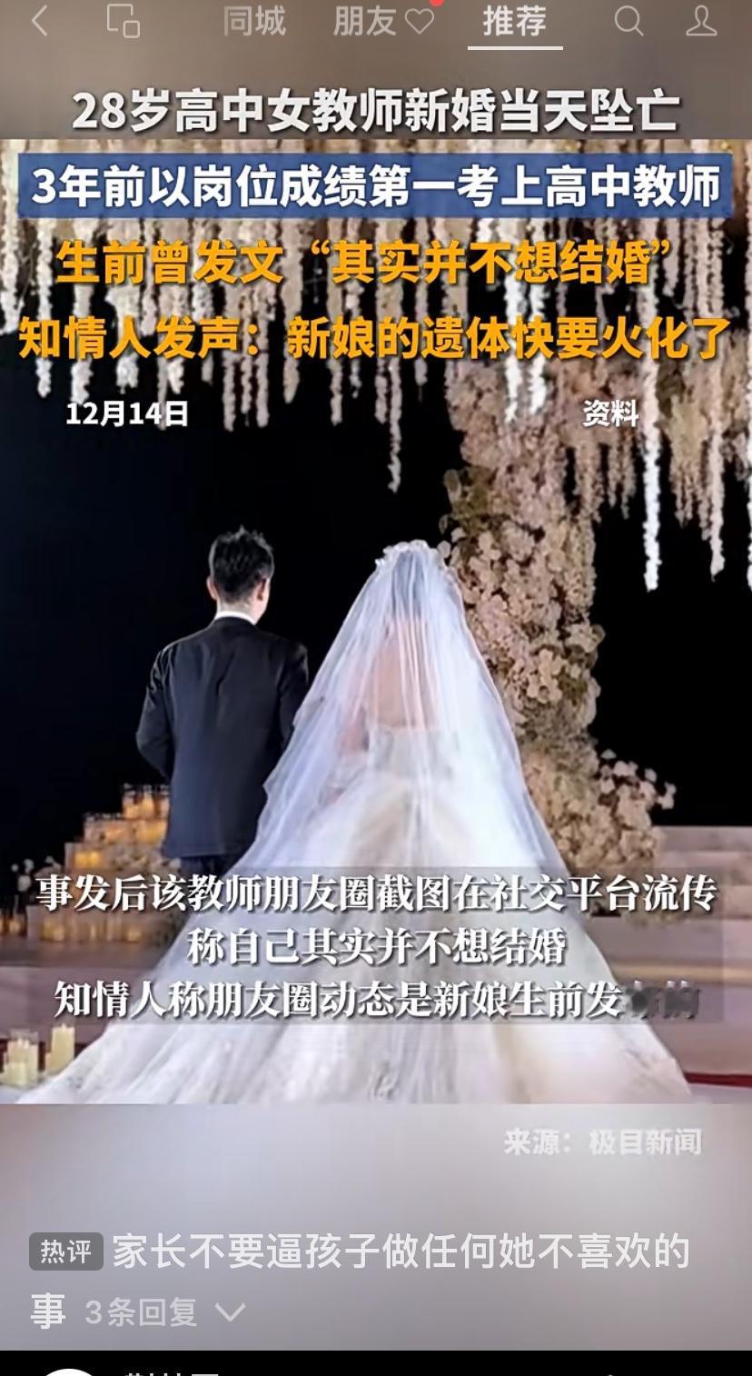 河南鲁山,新婚当天从7楼坠落的28岁高中女教师,她的遗体已被送到binyiguan!更多细节、内情曝光! 1、她是当地重点的高中历史教师。她以面试笔试总成绩第一考编入校任教担任历史教学,她本应该明艳热烈热情温暖的过完她的一生……… 这两天心口像堵住了一样疼,爱人先爱己,她始终是太善良了,选择伤害自己也没有违背父母…… 据悉她走后鲁山下了很大的雪,或许老天爷也在心疼她,用铺天盖地的雪来抱抱她…… 2、她生前朋友圈最后一条的第一句:我清楚的认识到我自己最大的价值就是结婚……[苦涩][苦涩]她其实不想结婚,可父母以死相逼,她自己抗争了11年,最后还是失败了。哎,这个老师最后一刻不知道走的该有多绝望,不,与其说是绝望,更应该是解脱吧,她完全可以去一个陌生的城市,找个工作好好生活的。 3、多么希望她的人生,能像逆袭爽文一样重启。在小县城里,能有一份令人羡慕还体面的编制工作已是人中龙凤了,也正是这份稳定的工作,让她没有离乡高飞的勇气吧,没有了编制工作的羁绊,也许她会活的洒脱一些,可怜的傻闺女。 4、她很善良,如果波及到新郎或者楼住户,肯定不是她的本意,愿她来世能自由! 5、最后她说,麻烦朋友,把骨灰撒向有太阳和大风的地方,是因为知道娘家婆家都靠不住麽? 6、她父母如今一定后悔催婚。她们的女儿长的也好看,工作也挺好关键是才28岁,着急啥呢,父母也太着急了,30好几没结婚的一大把,再说现在不想结婚的人多了。结婚不结婚是女孩自由。结婚过一辈子。不结婚也是过一辈子。 老一辈他们特别在意亲戚朋友的看法,都比着谁先当爷爷奶奶,还怕孩子孤独终老。 她的悲剧,是无数年轻人的缩影。在“催婚”“催育”的压力下,多少人被迫放弃事业、放弃梦想、放弃自我,活成别人期待的样子?他们被告诉“到了什么年纪就该做什么事”,被要求“不要让父母丢脸”,被灌输“不结婚的人生是不完整的”。可谁问过他们:“你快乐吗?你愿意吗?你的人生,究竟是谁的?” 大家怎么看这件事? 教师坠楼事件
