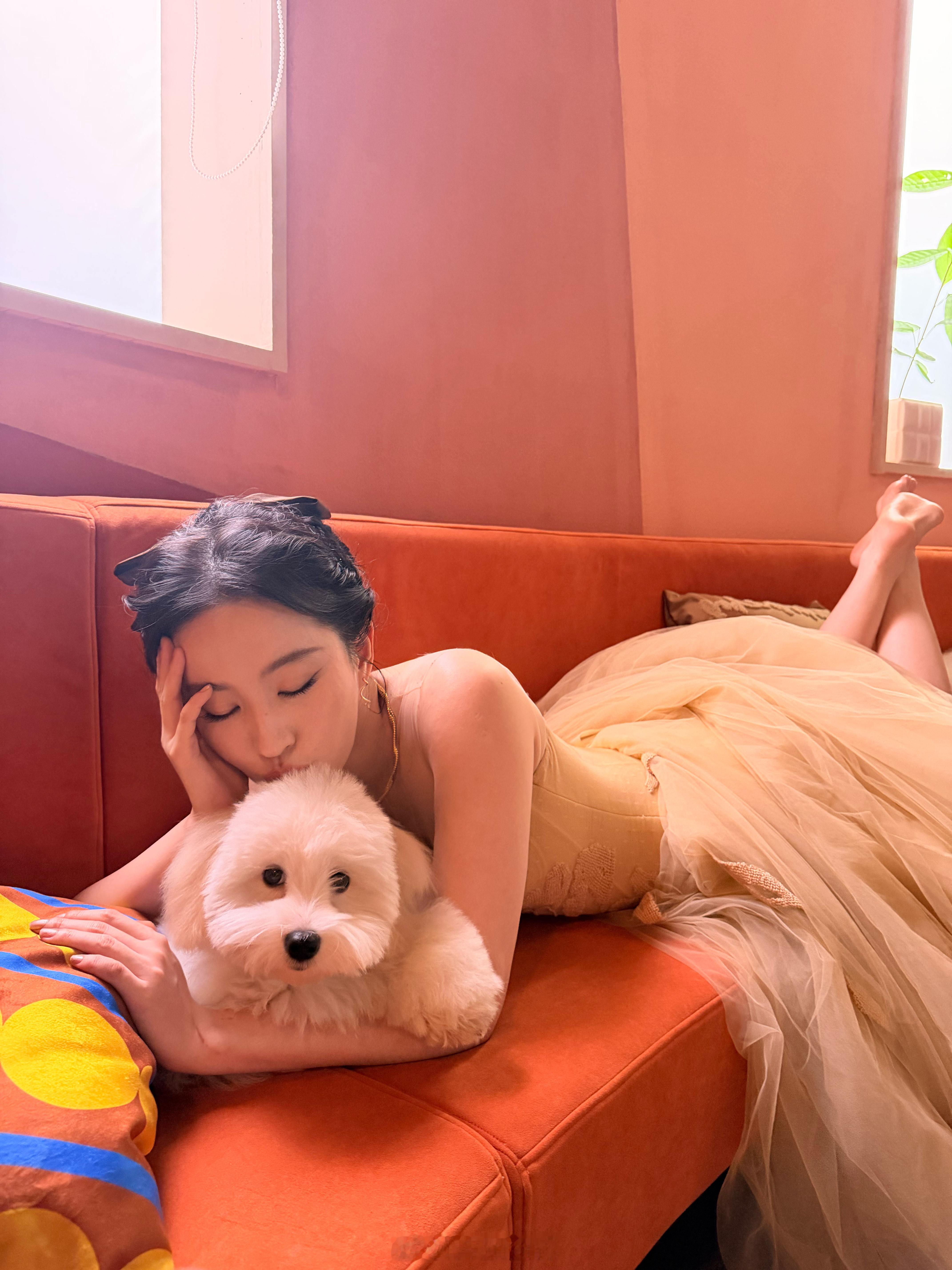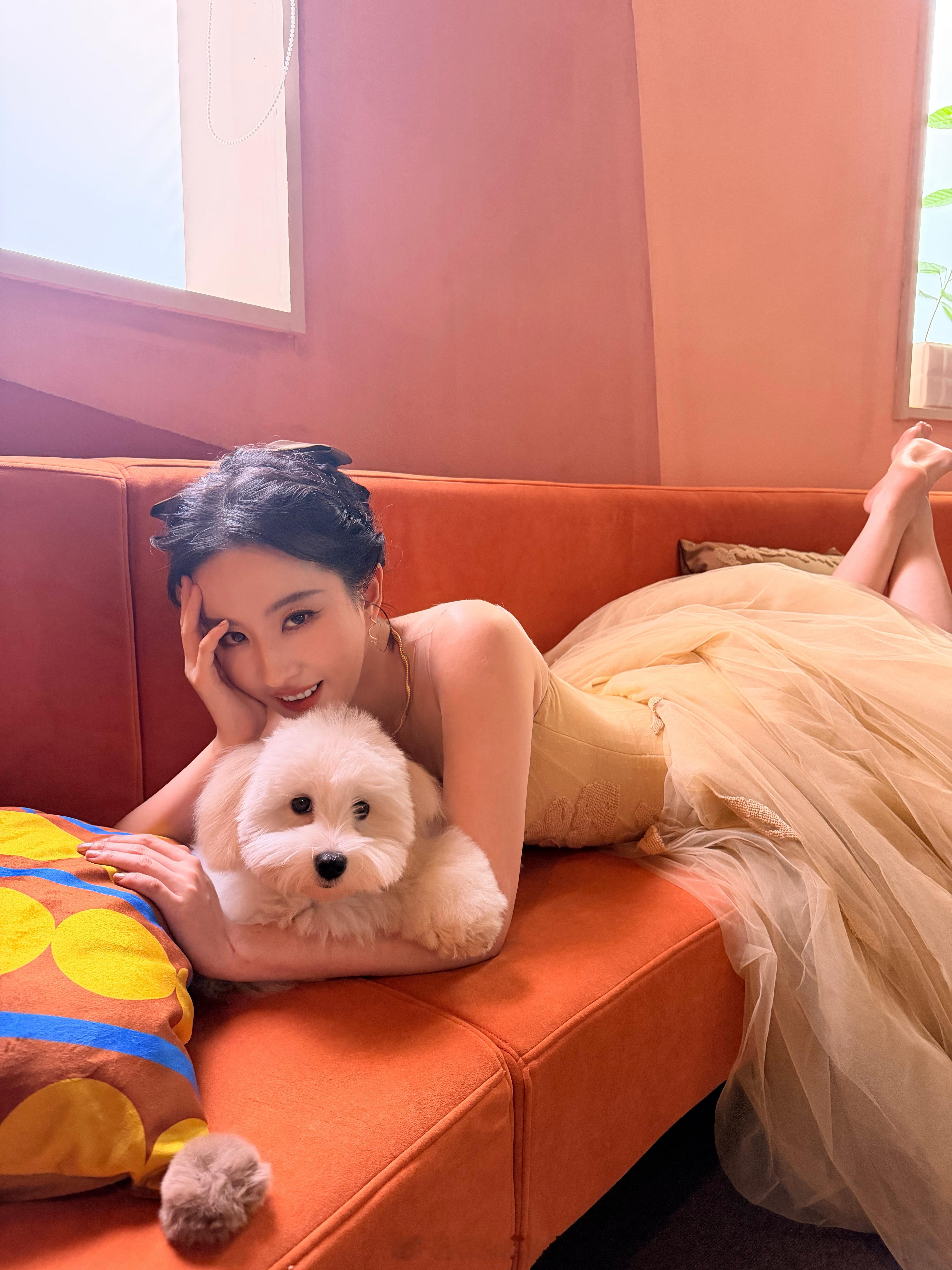 刘亦菲的狗狗好像玩偶一样可爱呀!天仙真的超美的!刘亦菲晒初雪哈哈合照