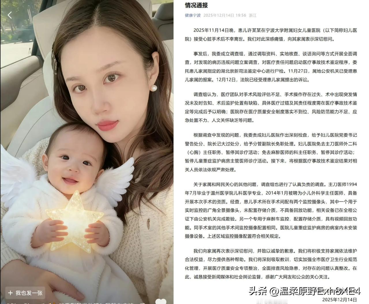 小洛熙的事情有进展了,定性为“重大医疗纠纷”,公安机关已立案,法院受理诉讼。前期调查,给出处分措施: 医院管理层:党委书记警告,院长记大过,分管副院长免职; 涉事医务人员:主刀医生陈某贤免去职务并暂停执业;麻醉科主任及重症主管医师同步免职停诊; 12月14日,宁波市卫发布通告,监控符合规定,有一个麻醉车监控,有回放功能可查看。 剩下最重要的就是尸检报告了,看能否定性陈某贤构成医疗事故罪的关键点。 另外6月份那名13个月大患儿,同类型手术死亡,查明两起事件均存在手术超时、隐瞒操作等相似问题。 这件事情已经过去一个月了。有网友说,这不是一道简单的对错题,背后涉及复杂的医学判断和法律责任,需要专业调查。 我认为他说得很在理,网上口水战只会增加对立,没必要。正确的态度是,带上脑子,打开官方发布渠道,坐等通告,也是对家属的支持! 希望早日真相大白,小洛溪能笑着离开,妈妈能释怀!我们也能对医疗放心!