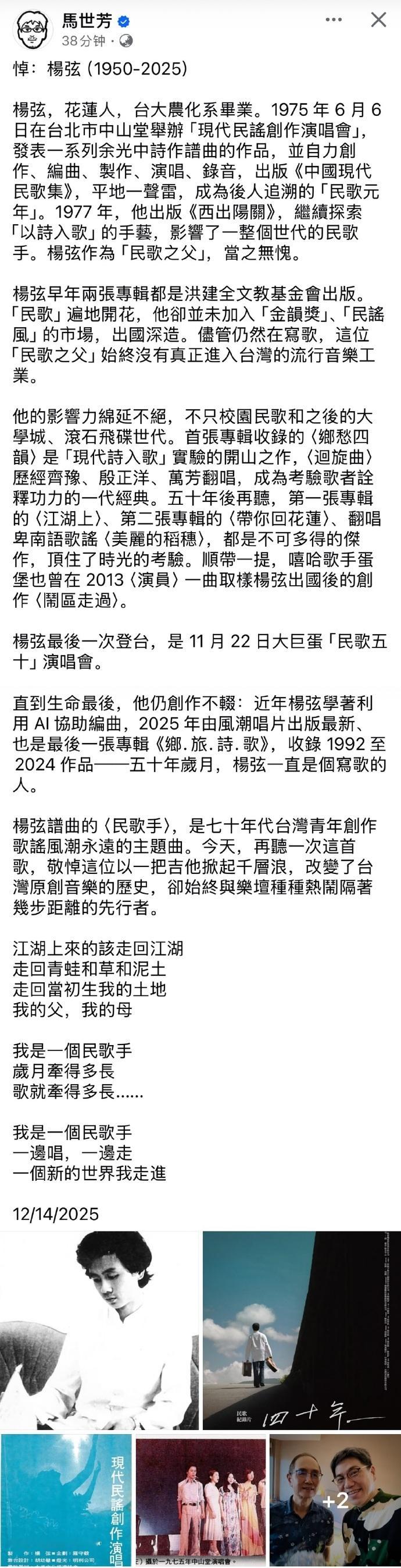 杨弦去世台湾民歌之父杨弦去世 台湾「民歌之父」杨弦逝世,他在1975年举办「现代民谣创作演唱会」,并陆续出版民歌作品,影响了后续的台湾民歌浪潮,改变了台湾原创音乐的历史。