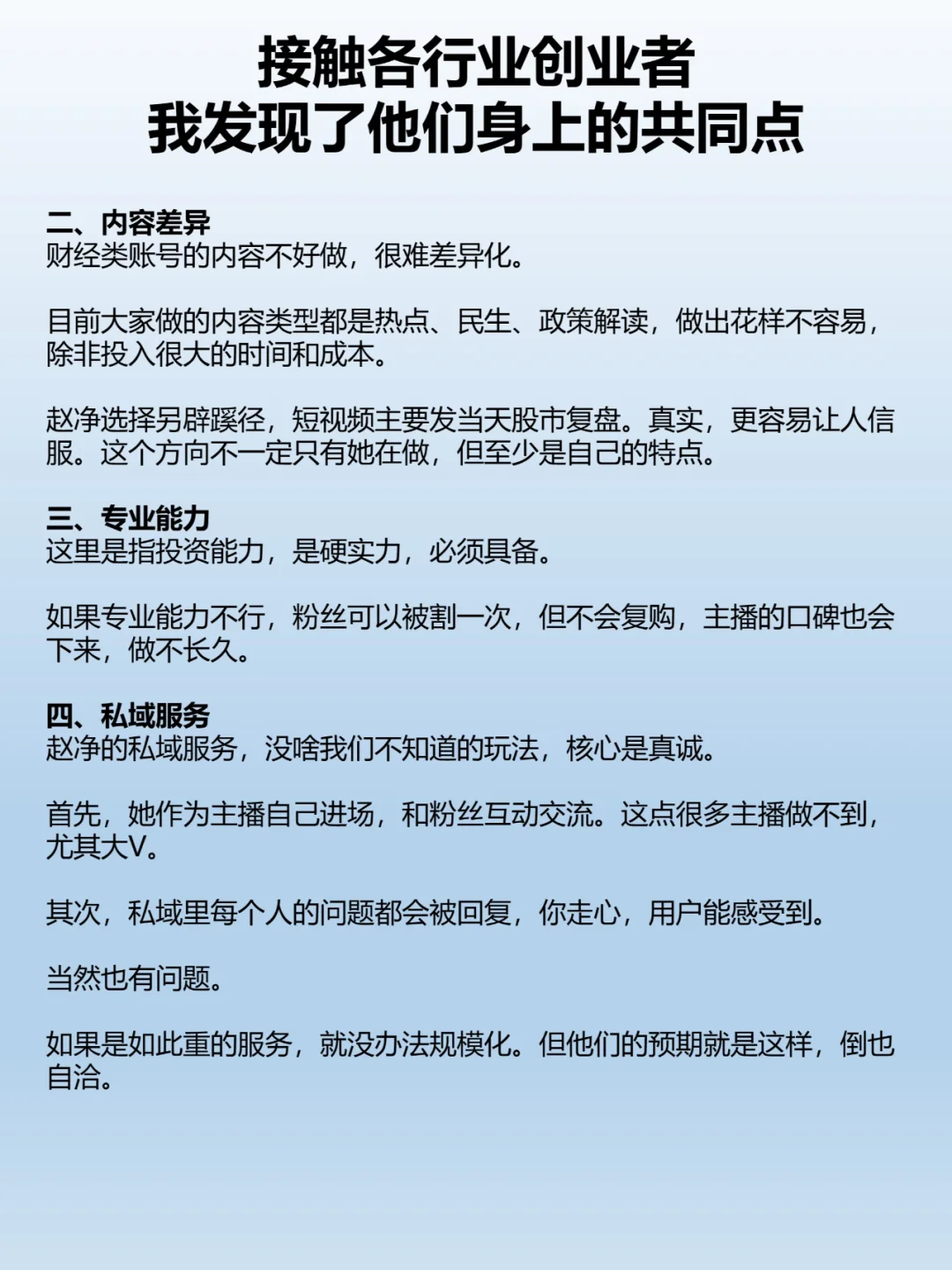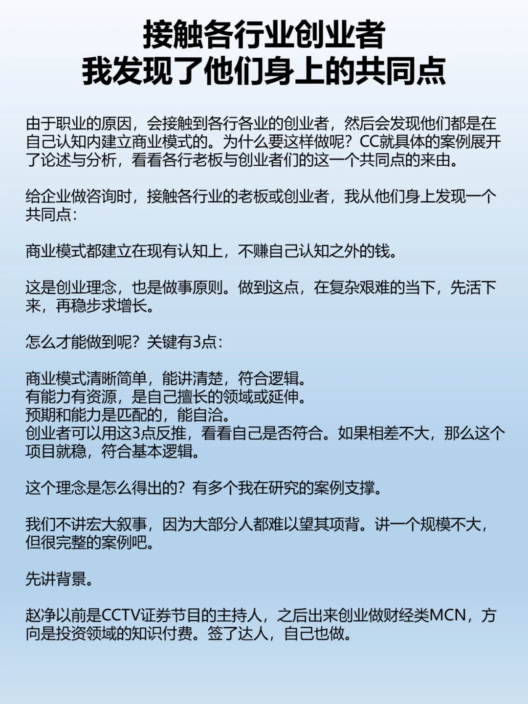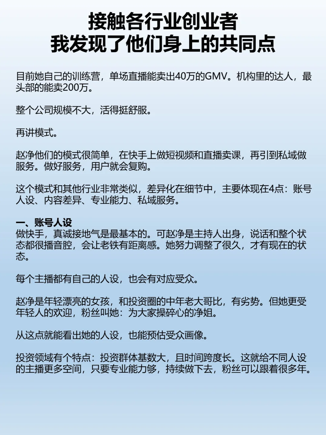 由于职业的原因,会接触到各行各业的创业者,然后会发现他们都是在自己认知内建立商业模式的。为什么要这样做呢?CC就具体的案例展开了论述与分析,看看各行老板与创业者们的这一个共同点的来由。 给企业做咨询时,接触各行业的老板或创业者,我从他们身上发现一个共同点: 商业模式都建立在现有认知上,不赚自己认知之外的钱。 这是创业理念,也是做事原则。做到这点,在复杂艰难的当下,先活下来,再稳步求增长。 怎么才能做到呢?关键有3点: 商业模式清晰简单,能讲清楚,符合逻辑。 有能力有资源,是自己擅长的领域或延伸。 预期和能力是匹配的,能自洽。 创业者可以用这3点反推,看看自己是否符合。如果相差不大,那么这个项目就稳,符合基本逻辑。 这个理念是怎么得出的?有多个我在研究的案例支撑。 我们不讲宏大叙事,因为大部分人都难以望其项背。讲一个规模不大,但很完整的案例吧。 先讲背景。 赵净以前是CCTV证券节目的主持人,之后出来创业做财经类MCN,方向是投资领域的知识付费。签了达人,自己也做。 目前她自己的训练营,单场直播能卖出40万的GMV。机构里的达人,最头部的能卖200万。 整个公司规模不大,活得挺舒服。 再讲模式。 赵净他们的模式很简单,在快手上做短视频和直播卖课,再引到私域做服务。做好服务,用户就会复购。 这个模式和其他行业非常类似,差异化在细节中,主要体现在4点:账号人设、内容差异、专业能力、私域服务。