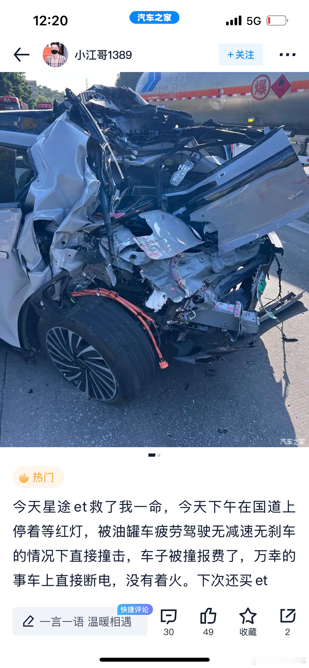 汽车民生 “下次还买星途et”,原因简单粗暴!网友发文说:“今天星途et救了我一命,下午在国道上停着等红灯,被油罐车疲劳驾驶无减速无刹车的情况下直接撞击,车子被撞报费了,万幸的是车上直接断电,没有着火。下次还买et。”网友“下次还买et”,原因简单粗暴。发生这么大的事故竟然电车没起火,事后得知是直接断电,要不是这次“亲身体验”,很多人会觉得这是在为星途站队,诧异不?