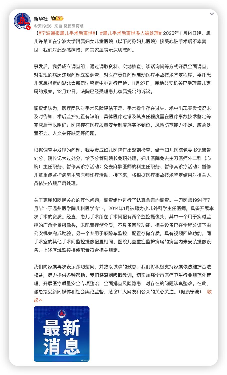 宁波通报患儿手术后离世,医疗团队对手术风险评估不足、手术操作存在过失、术中出现突发情况未及时告知、术后监护处置有缺陷,具体医疗过错及其责任程度需在医疗事故技术鉴定等完成后予以明确;医院存在医疗质量安全制度落实不到位、风险防范能力不足、应急处置不力、人文关怀缺乏等问题。