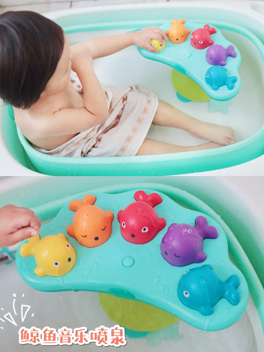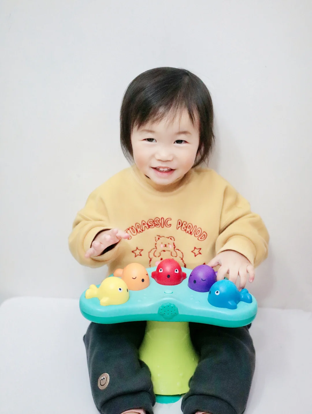 这个造型特别可爱,Cyndi不论玩不玩水都喜欢抱着玩,洗澡的时候玩,🐳就可以喷出水来,她就拿小手去感受喷出来的水花,平常玩就听着音乐🎶敲打,玩起来也很简单,底部带有吸盘,不用担心倾倒~Cyndi本来就喜欢🛀🏻,有了这个之后更爱了,每次洗完澡都不想从浴盆里起来😂