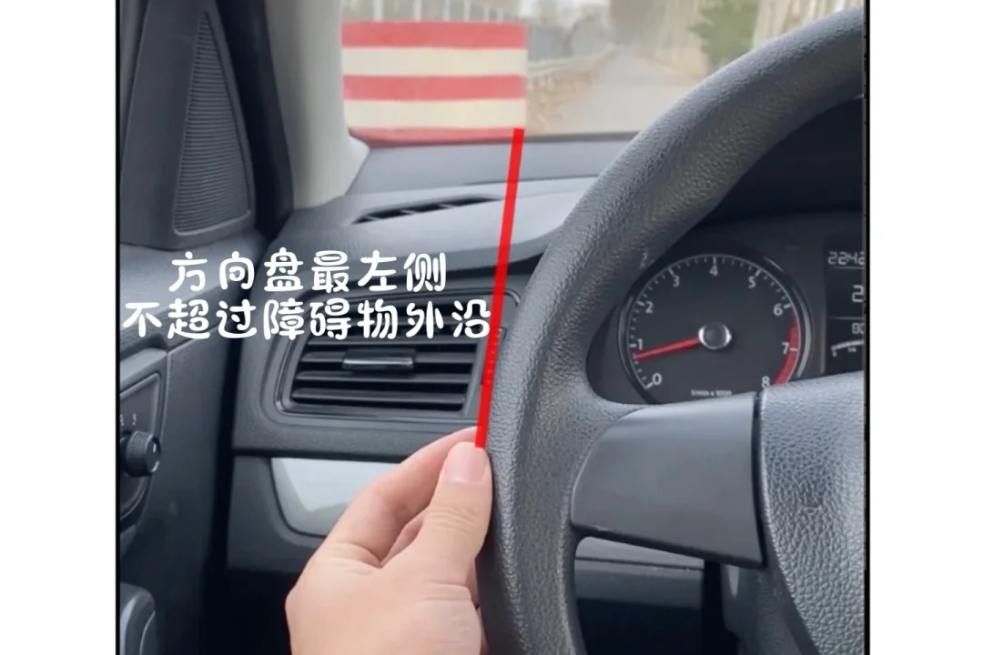 方向盘最左侧大概是左车轮位置,基于这一点,可以做个判断,方向盘最左侧不超过障碍物外沿时,可以安全通过,否则要调整。