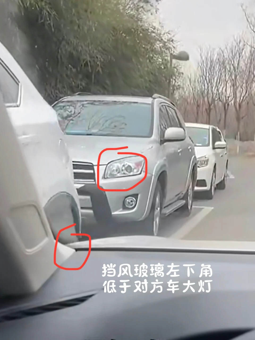 注意:会车的避让原则是谁有条件谁让,挡风玻璃左下角低于对方车大灯可安全通过。