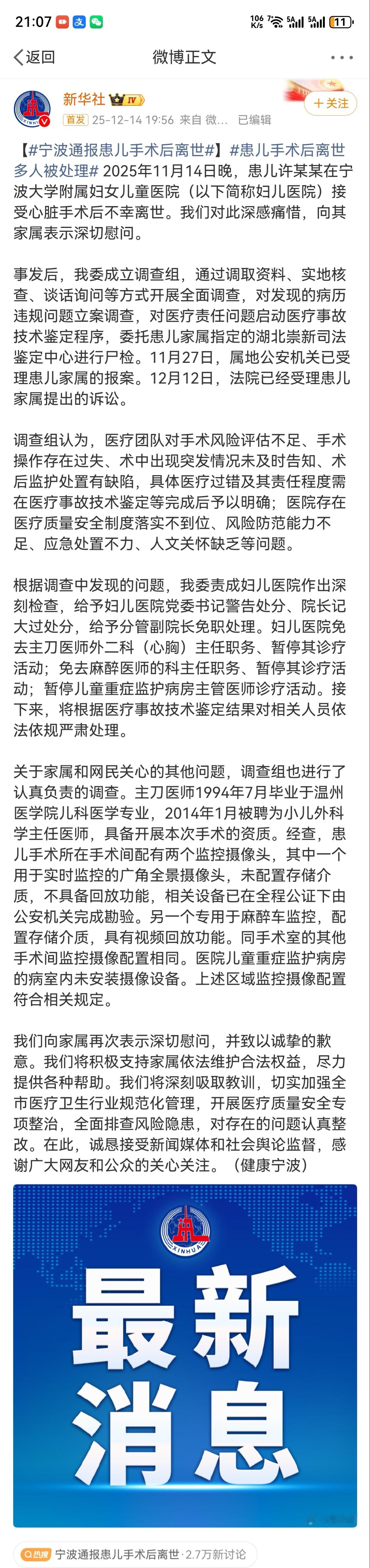 宁波通报患儿手术后离世看了官方通报,停诊,处分,罢免,就这?一个浙江省的三甲医院,手术室监控没有回放,说出去都要笑掉大牙,丢脸哦。小洛熙死了,人回不来了! 杭州·南岸花城