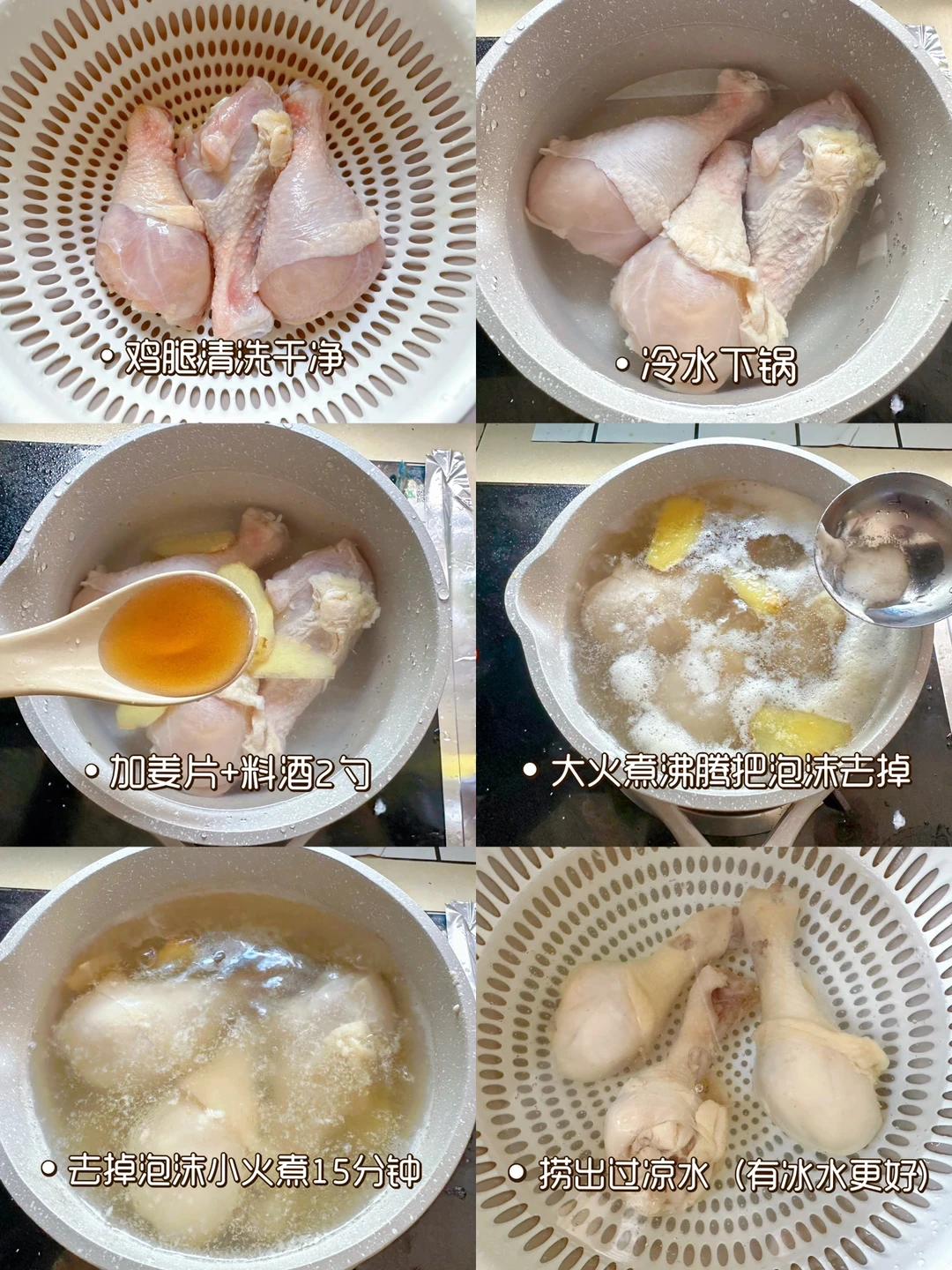 1⃣️鸡腿洗干净冷水下锅,加2勺料酒,姜片煮沸腾,去除泡沫,小火煮15分钟,煮熟。捞出放入冷水中浸泡凉(加入点冰块,口感会更好)凉后鸡腿去皮撕成小块。