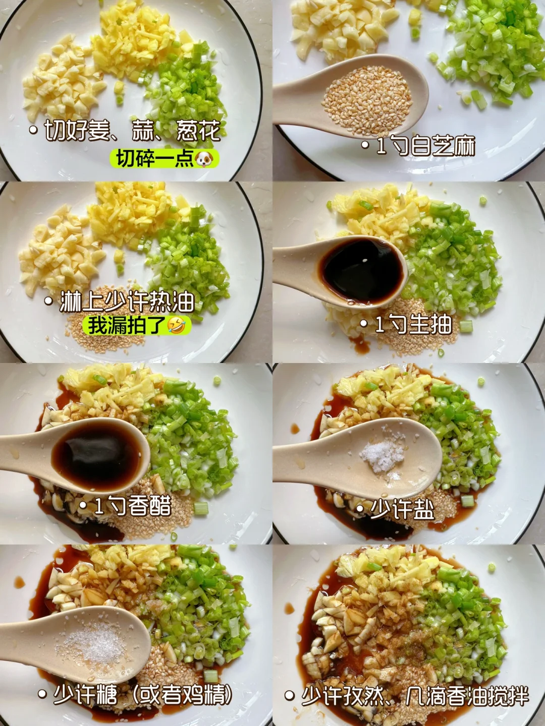 2⃣️调料汁:姜+蒜蓉+1勺白芝麻+淋上热油,放入1勺生抽+1勺香醋+少许盐+白糖(减脂可以不加)加入少许的孜然和几滴香油搅拌均匀!