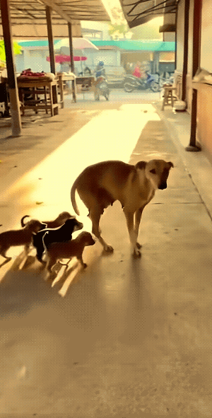 单亲狗妈妈日常生活也容易,它独自一人撑起一个家,乞讨点吃的也是双手鞠躬有礼貌有礼节! 虽是流浪狗带着一群小狗,看了也是不次于一些明星的。 老板娘真的不错,看到它的到来乞求,拿来了不少吃的。 今天这一大家子,吃的问题解决了,可不知明天它们能不能讨到吃的……