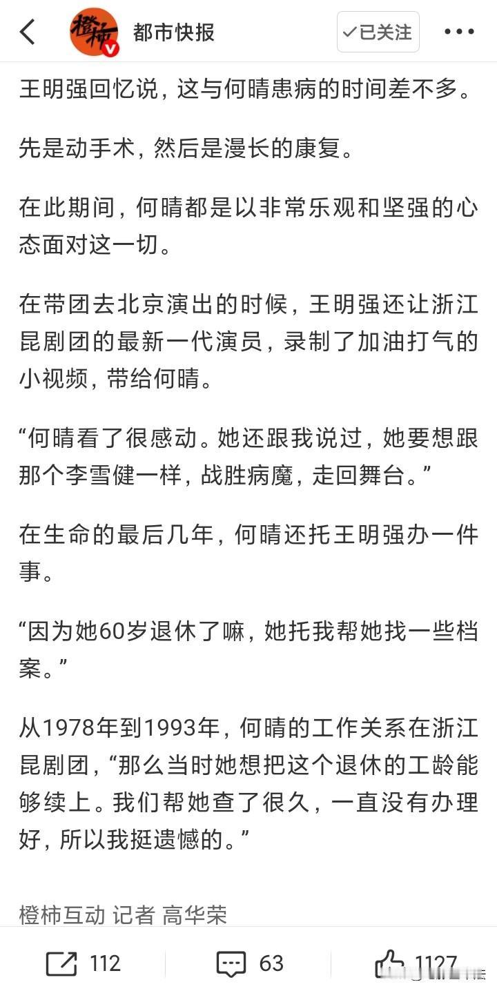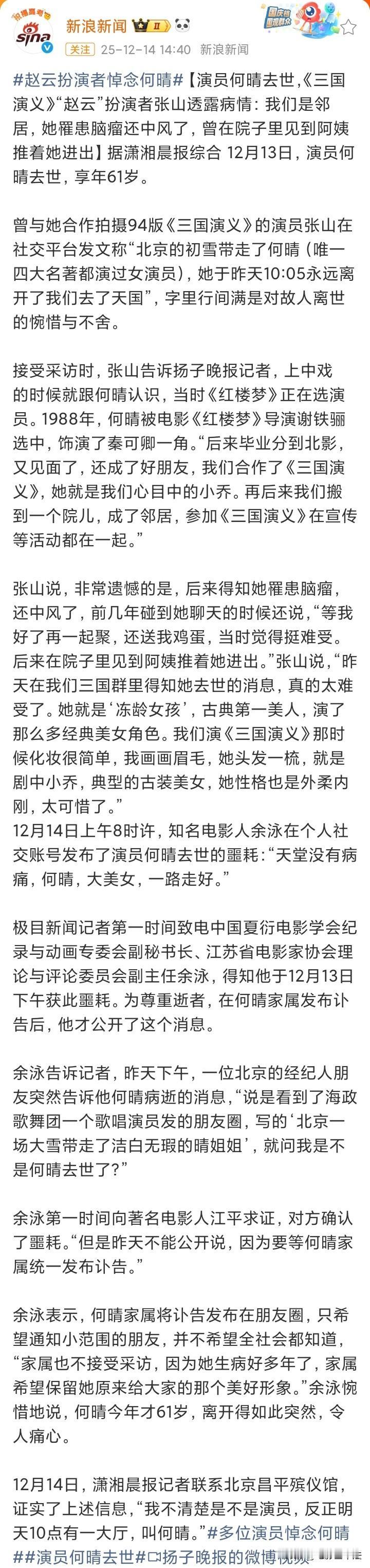 何晴去世后,她有2个朋友的做法让人觉得非常恶心! 一是94版《三国演义》中赵云的扮演者张山,张山是何晴的邻居,他未经何晴家属同意,私自在社交平台泄露何晴病情,说何晴不但罹患脑瘤还中风。 二是她的同班同学兼好友,浙江昆剧团原团长王明强,王明强在何晴去世后晒出了何晴中风期间的照片,照片看着让人吓一跳,完全破坏了她在观众心目中的美感。(本人发的图片已打码,原图实在是不忍心放出来) 这两个人很不厚道,辜负了何晴的信任,美了半辈子的何晴直到去世大家才知道她生病,可见有多注意自己在观众心目中的形象,而不管出于什么动机和目的,这个时候曝光他人病情和患病期间的照片都很不应该,也很不厚道,这是对何晴的不尊重!