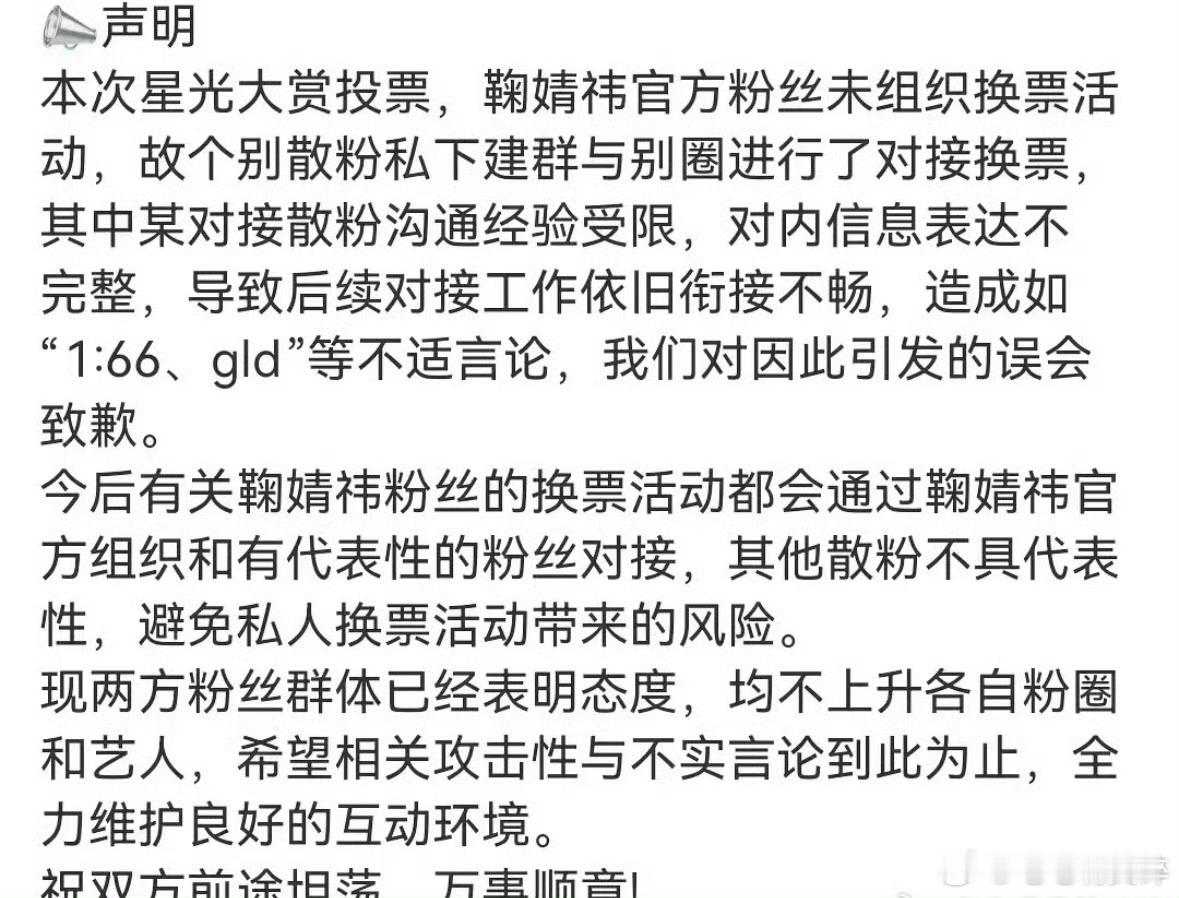 魔道祖师粉丝给鞠婧祎粉丝这次星光大赏换票的事说明了,说不存在欺骗行为,因为信息不对等,也表达了歉意