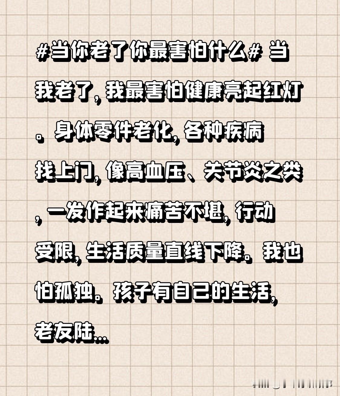 当我老了,最怕健康出问题。身体机能衰退,高血压、关节炎等疾病纷至沓来,发作时痛苦难耐,行动不便,生活质量大打折扣。 我也惧孤独。孩子各有生活,老友渐次离世,若老伴先走,偌大屋子只剩自己,无人可聊,寂寞蚀骨。 还怕自己无用。跟不上时代,对新事物一无所知,似被社会遗弃。经济不独立,依赖他人,浑身不自在。