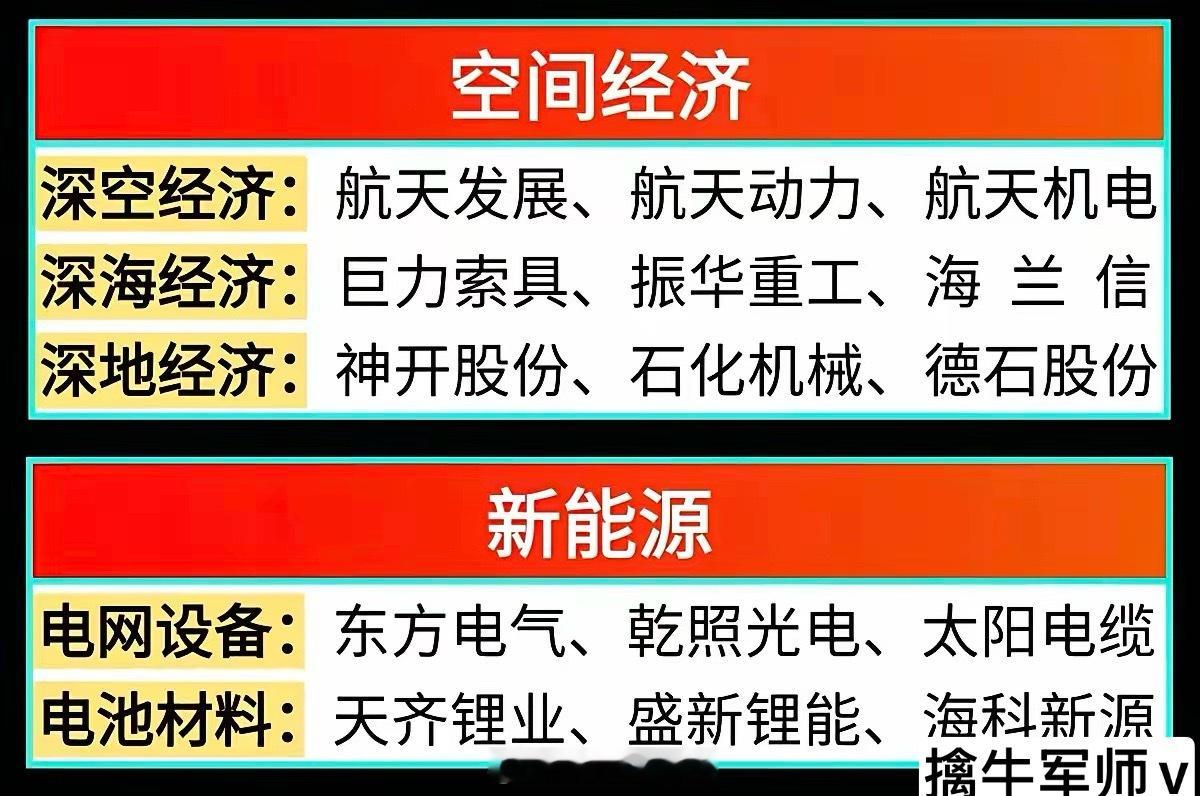 2026年热门方向梳理(下)今年核心布局方向划分为空间经济与新能源两大主线,空间经济进一步拆解为深空、深海、深地“三深”细分领域,聚焦航天探索、海洋资源开发、地下资源勘探利用;新能源则围绕电网设备升级与电池材料供应两大核心环节展开。1. 航天发展背靠航天科工集团,是深空经济与商业航天核心标的,布局航天信息安全、毫米波技术及海工装备,其航天通信系统适配深空探测数据传输需求,技术优势助力深空领域业务拓展。2. 航天动力航天科技集团六院旗下,深空经济中火箭动力核心供应商,主营液体火箭发动机零部件与流体机械,为长征系列火箭及商业火箭提供动力支持,深度绑定深空探测工程。3. 航天机电聚焦深空光伏与卫星应用,布局星载光伏组件及军民融合航天器件,其光伏产品适配深空探测器能源供给需求,2025年卫星应用业务营收占比达20%,是深空经济中能源配套的关键标的。4. 中国卫通深空通信核心标的,运营自主可控的通信广播卫星资源,为深空探测提供卫星通信保障,2025年高轨卫星通信营收占比超90%,新增深空探测通信定制服务,业务与深空经济深度契合。5. 巨力索具深海经济核心配套企业,主营特种索具、海洋工程装备,其深海系泊索具应用于深海钻井平台与海底矿产开发,2025年海洋工程索具订单同比增长45%,技术实力领跑深海装备配套赛道。6. 振华重工全球港口机械龙头,布局深海工程起重机、海上风电平台等装备,其深海施工设备适配海底隧道、油气开发工程,2025年深海工程业务营收占比提升至18%,是深海基础设施建设的核心标的。7. 海兰信深海经济中海洋信息化龙头,主营船舶导航与海底数据中心,其海底数据中心技术突破深海存储瓶颈,2025年与中海油合作布局深海数据基站,海洋信息化业务营收增长70%。8. 中集集团深海装备与工程龙头,布局深海养殖装备、海上浮式生产平台,其深海装备适配海洋资源综合开发,2025年深海业务营收占比提升至15%,订单覆盖东南亚深海开发项目。9. 神开股份深地经济中油气勘探设备龙头,主营钻井测井设备与油气仪器,其深地钻井工具适配超深井勘探需求,2025年参与塔里木盆地超深井项目,勘探设备营收占比超60%,深度受益深地资源开发。10. 石化机械中石化旗下深地装备核心企业,聚焦深地油气开采钻机、压裂设备,其超深井钻机可适配万米深地勘探,2025年深地装备订单同比增长55%,是深地能源开发的设备中坚。11. 德石股份深地经济中钻具细分龙头,主营石油钻采专用工具,其金刚石钻头适配深地硬岩钻井,2025年深地钻具营收占比提升至40%,产品出口至中东、中亚等深地勘探市场。12. 杰瑞股份深地油气开发设备龙头,主营压裂设备与油田服务,其超深井压裂技术突破深地油气开采瓶颈,2025年为长庆油田深地项目提供设备配套,油田服务营收增长65%。13. 东方电气新能源电网设备龙头,主营燃气轮机、特高压设备及风电整机,其特高压换流设备适配新能源电网升级,2025年电网设备营收占比达30%,同时布局核聚变能源装备,多赛道协同发展。14. 乾照光电电网设备配套标的,主营半导体照明与光伏外延片,其光伏产品为电网储能系统提供能源支持,2025年光伏外延片营收同比增长45%,技术升级推动产品在电网领域的应用。15. 太阳电缆电网设备中线缆核心企业,主营高压电缆与特种电缆,产品适配新能源电网输电工程,2025年中标南方电网特高压线缆项目,电网线缆营收占比超70%,订单储备充足。16. 特变电工新能源电网设备龙头,主营特高压变压器与光伏EPC,其特高压设备是新能源电力输送的核心,2025年电网设备营收同比增长40%,光伏与电网业务形成协同发展效应。17. 天齐锂业全球锂资源龙头,主营锂矿开采与锂盐加工,是新能源电池材料核心上游供应商,2025年锂盐产能突破18万吨,动力电池需求带动锂盐销量增长35%,资源优势稳固行业地位。18. 盛新锂能锂资源与锂盐加工企业,布局澳洲锂矿与国内锂盐产能,其电池级碳酸锂适配动力电池生产,2025年锂盐业务营收占比超80%,新能源汽车销量增长推动业绩持续提升。总结空间经济的“三深”开发与新能源产业链升级是资本市场的两大核心主线,空间经济依托深空探测、深海开发、深地勘探的产业政策与技术突破,相关标的凭借设备配套、技术研发优势承接行业红利;新能源则受益于电网升级与动力电池需求增长,电网设备企业聚焦特高压与新能源电力传输,电池材料企业依托上游资源与材料技术占据产业链核心。两类标的兼具产业趋势与业绩增长逻辑,短期可把握题材情绪机会,中长期需关注技术商业化落地与订单兑现能力,核心龙头的竞争优势将持续凸显。本文涉及资讯、数据等内容来自网络公共信息,仅供参考,不构成投资建议!
