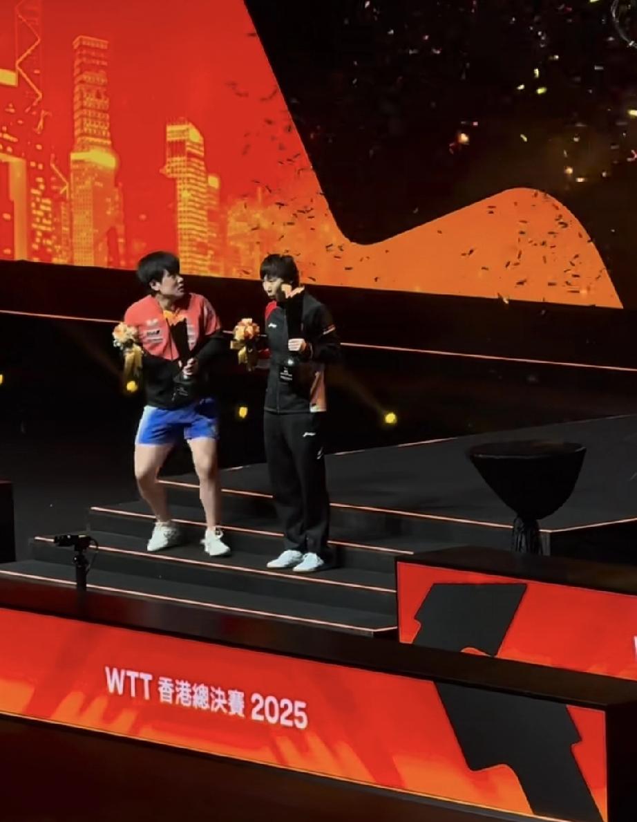 WTT香港年终总决赛颁奖礼,女单冠军王曼昱与男单冠军张本智和一起合照时间,主办方发射带响声的金纸雨,直接吓了两个人一跳! 尤其是张本智和被吓的缩缩起来,曼昱看着表情惊讶,但是肢体动作还是非常镇定!不愧是我大中华的女战士!