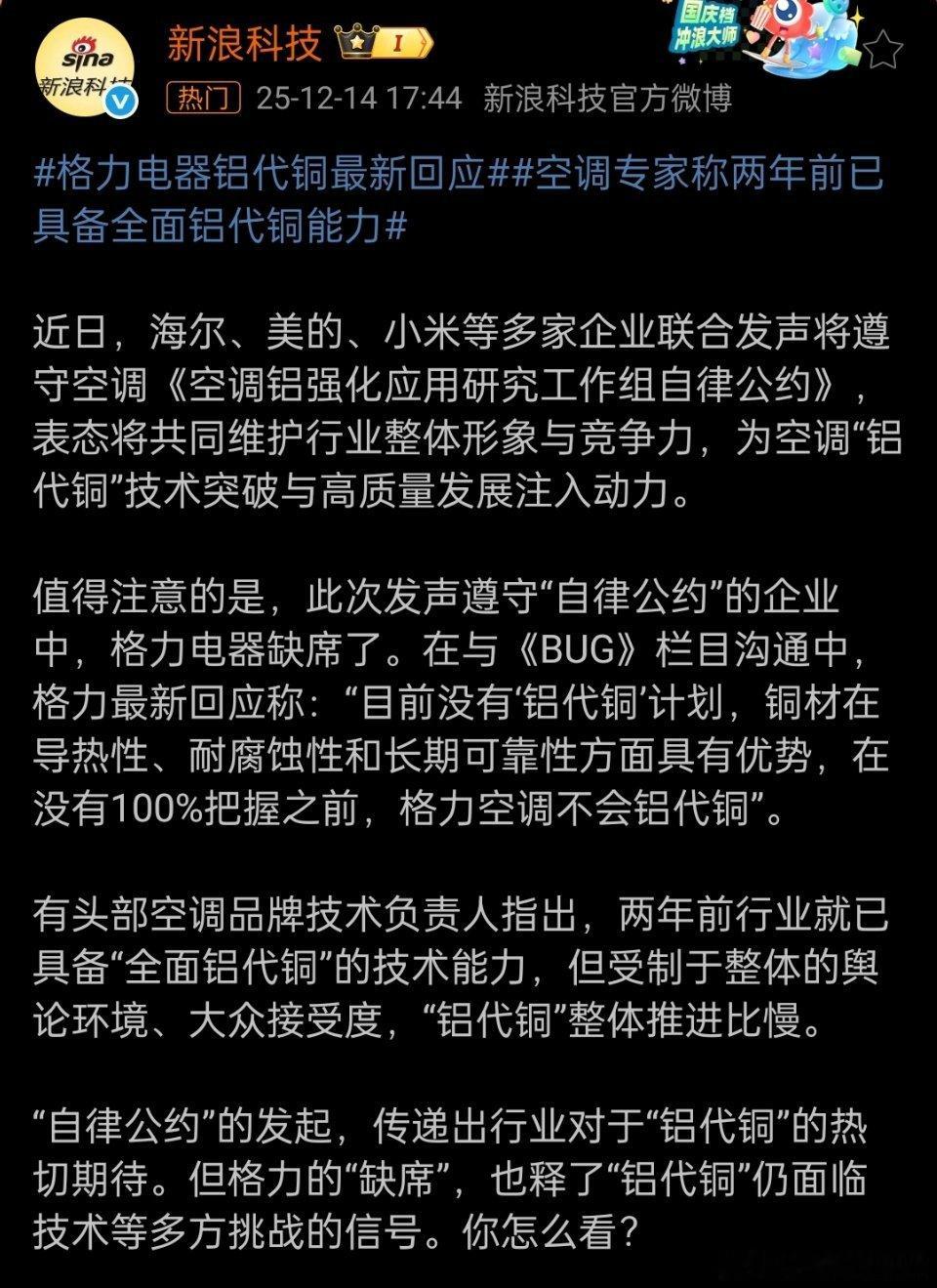 格力电器铝代铜最新回应空调用铝还是用铜,商家必须要明确标出来,让消费者有知情权和选择权。我觉得这是最重要的。