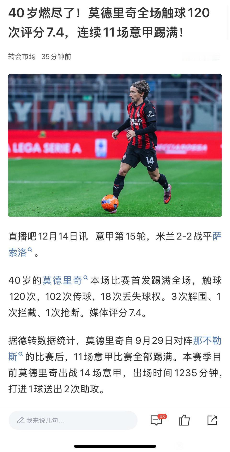 Ac米兰虽然平了错失榜首,但莫德里奇真是劳模! 他40岁太老了,要是年轻5岁多好呀。 这样的超级球星,米兰只能等他老了才拿下,也就是莫德里奇想在豪门踢球才来。 不知道能不能拿个冠军,成为米兰名宿。[可怜]
