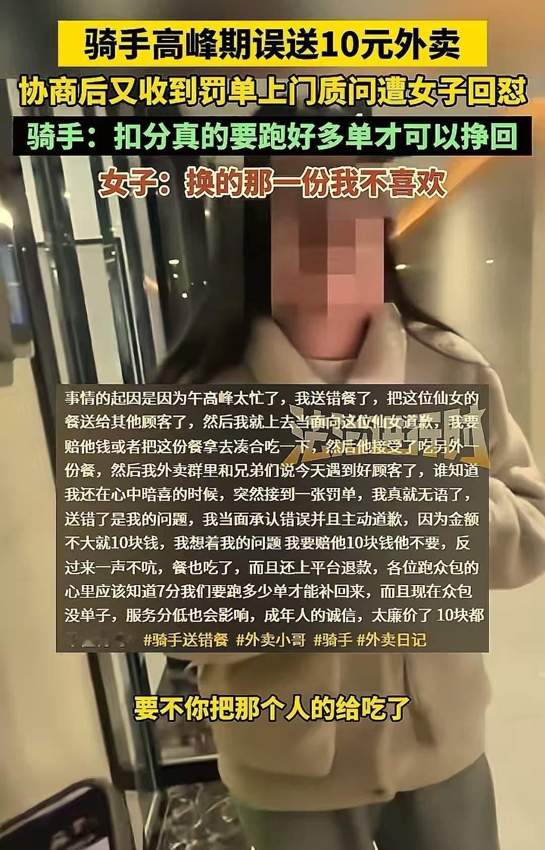 在这个快节奏的时代,外卖已经成为我们生活中不可或缺的一部分。我们习惯了点点点,期待着“秒达”的便利,却很少去想,送餐的背后,藏着多少人的努力与责任。安徽这位骑手的故事,或许就是千万外卖小哥的缩影,也折射出我们对“完美服务”的期待与现实之间的微妙平衡。 事情的起因很简单:一次普通的送餐,他不小心送错了订单。面对女顾客的指责,他没有推卸责任,而是第一时间表达了歉意,并提出了两个解决方案:一是让女顾客留下送错的餐,自己承担责任,吃了也无妨;二是带走餐品,赔钱或者重新购买一份。面对这样的善意,他以为事情就此结束,谁知女顾客选择了“留下”餐品,却在吃完后,选择了投诉。 这到底是怎么回事?难道我们对服务的期待已经变得如此苛刻?还是说,某些人已经忘记了,服务行业的“人情味”在哪里?这位骑手的善意被误解、被质疑,心里的委屈与愤怒,谁能理解?他用心良苦,却被一句“投诉”打得措手不及。 其实,这个故事的背后,隐藏着更深层次的社会心态:我们是否变得越来越难以满足?是否对别人的善意变得无感,甚至开始挑剔?在这个“快餐式”服务盛行的时代,我们是否也逐渐失去了对“人性”的耐心和理解?这不仅仅是一个送餐的小插曲,更是一面镜子,映照出我们对“善意”的期待与现实的落差。 然而,值得我们深思的是,这位骑手的行为值得点赞。他没有选择推诿责任,也没有在面对投诉时发脾气,而是用真诚和责任感来应对。或许,他的善意会被误解,但他的心是纯净的。这正是我们这个社会最需要的正能量:在纷繁复杂的生活中,依然有人愿意坚持善良,愿意用行动去温暖他人。 这个故事,也提醒我们每个人:在遇到不完美的事情时,是否还能保持一份理解和宽容?我们是不是也应该多一些耐心,多一些善意,而不是一味的指责和抱怨?毕竟,每个人都在努力,都在用自己的方式守护着那份温暖。 让我们记住这个骑手的坚持,也希望女顾客的选择能成为一种理解的桥梁。也许,下一次我们遇到类似的事情,也能多一份宽容和理解。毕竟,社会的温度,正是由无数像他一样的普通人,用善意和责任心共同点亮的。 所以,下次当你点外卖,或者在生活中遇到类似的“小插曲”,不妨想一想:我们是不是也可以多一份理解?多一份善意?也许,那个微笑、那一句“没关系”,就能让这个世界变得更美好一点点。外卖小哥
