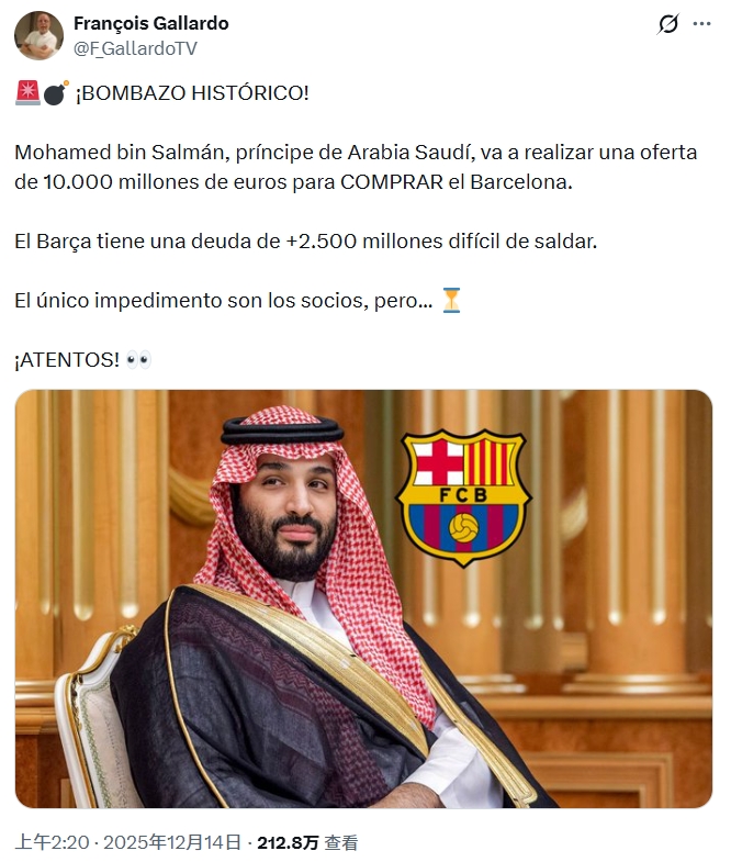 直播吧12月15日讯西班牙记者FrançoisGallardo再爆猛料,称沙特王储有意以100亿欧元收购巴萨。