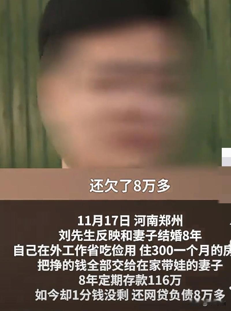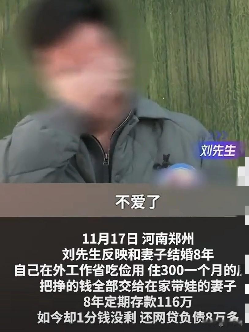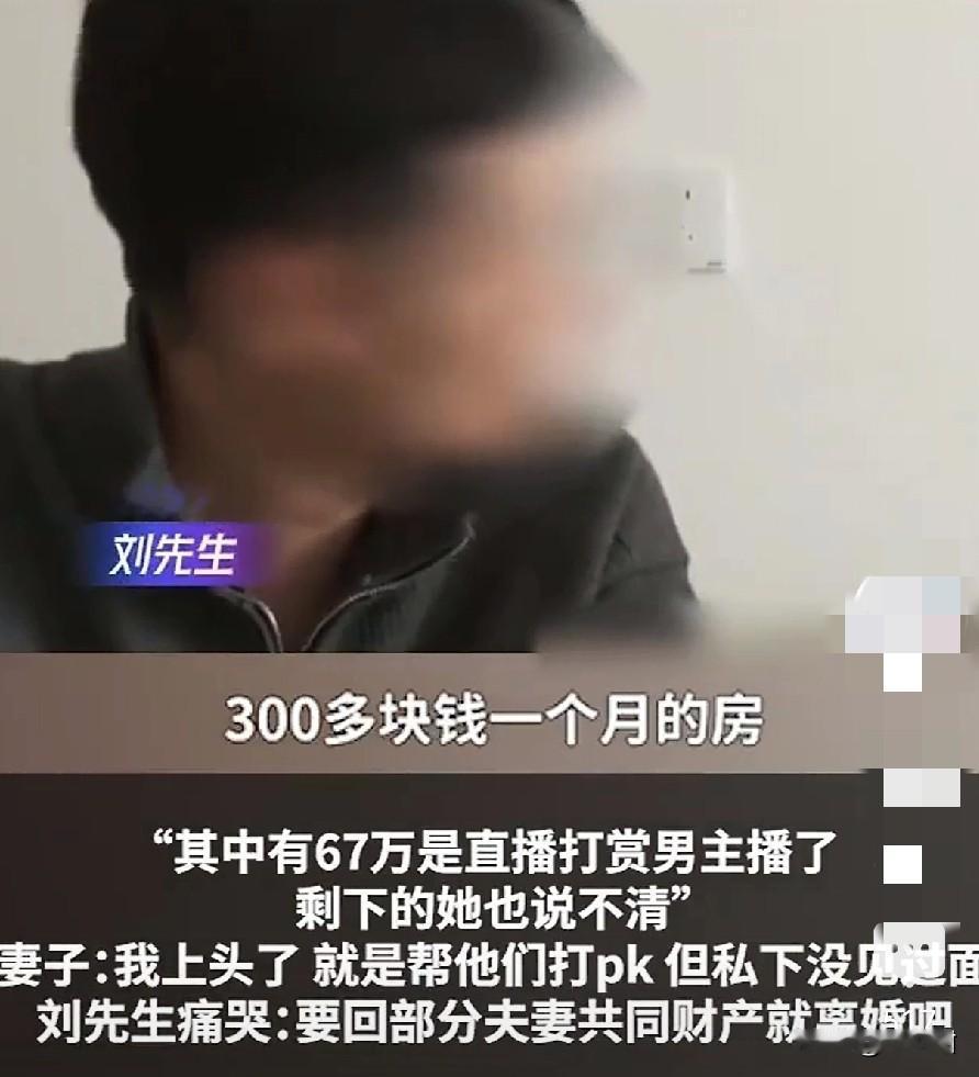 老公在外打工养家,租房300一个月,全职妻子在家耐不住寂寞,打赏男主播67万,还倒欠网贷8万? 近日,一刘姓先生哭诉,在郑州打工多年的他,将收入交给全职在家照顾孩子的妻子保管,自己在外省吃俭用,连租房都只花300一月,8年积累了116万元存款。 然而有天,他突然发现存款不仅耗尽,还欠下8万元网贷,其中67万元被妻子用于打赏网络男主播,其余的钱说不清楚来龙去脉。刘先生对此感到被背叛,希望追回部分财产并考虑离婚。 妻子表示刷直播的时候,对男主播一次打赏以后,被他私信哄得上头了,每次都以“宝宝”爱称,加上老公常年不在身边,就剩下钱了,就开始频繁接触,还帮他打“PK”,做榜姐。 被问到花这么多钱有没有私下来往,妻子矢口否认,但具体只有她自己才知道,毕竟耗尽的是存款上百万。 有律师表示,67万打赏远超日常开支,刘先生有权主张返还。但打赏被认定为“服务消费”还是“赠与”是关键,类似案例中,法院会按打赏性质部分返还,全额追回难度较大。​但是,妻子的8万网贷若未用于家庭生活,属妻子个人债务,刘先生无需承担。 (图片来自网络视频)