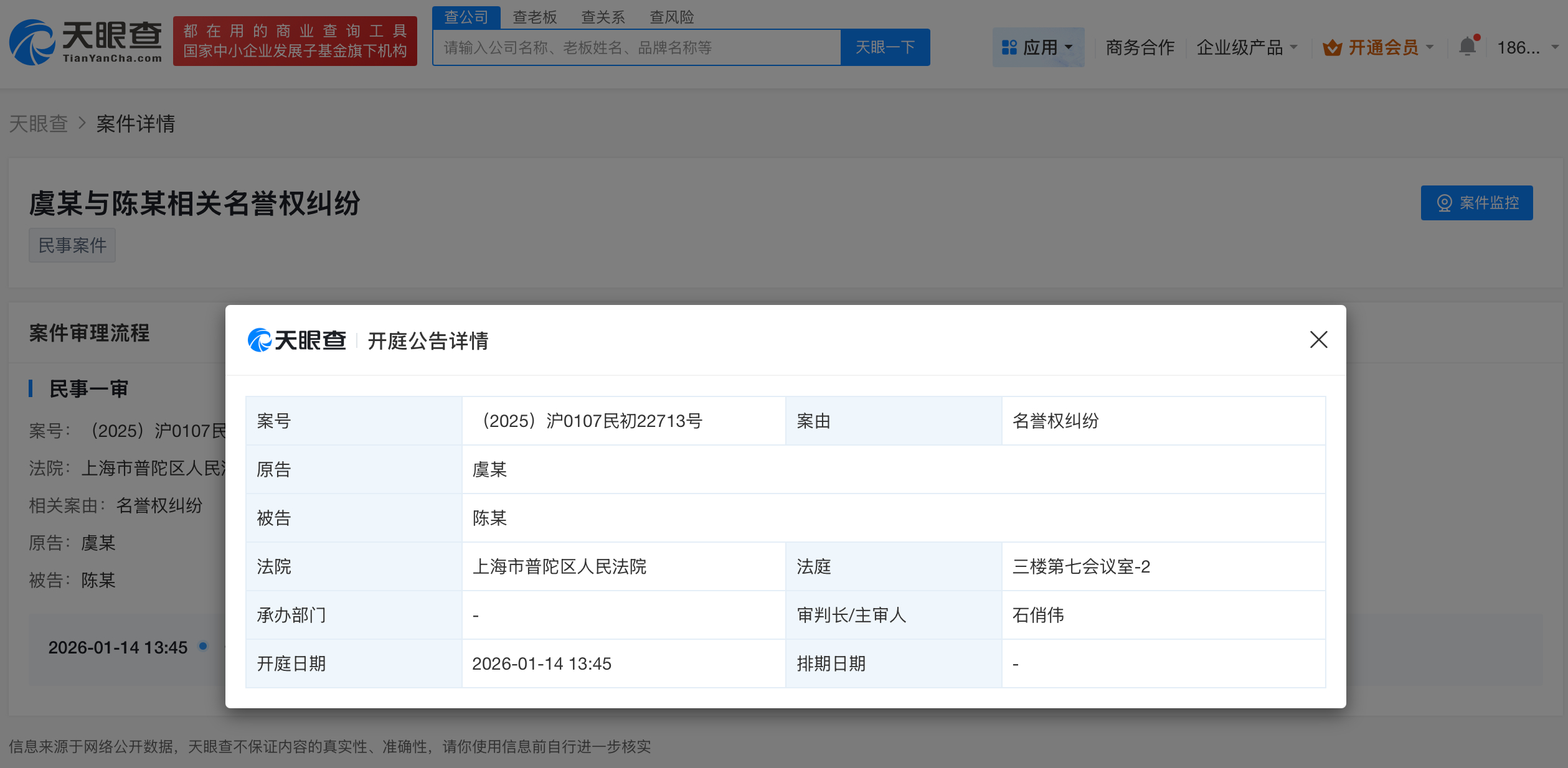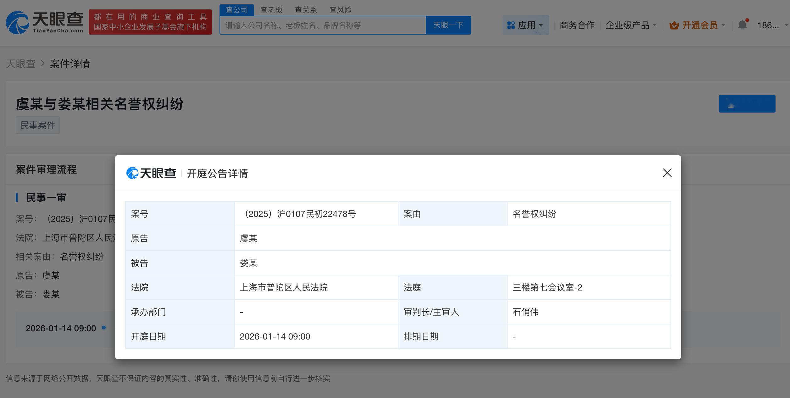 虞书欣虞书欣新增多起维权案虞书欣起诉多名黑粉侵权天眼查天眼风险信息显示,近日,虞书欣分别与娄某、陈某、栗某等相关名誉权纠纷案件新增开庭公告,原告均为虞书欣,上述三起案件将于2026年1月14日在上海市普陀区人民法院开庭审理。