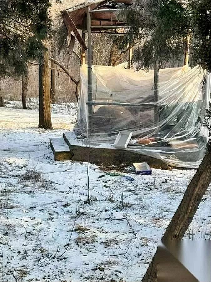 沈阳这大爷,把凉亭住成“家”了。 12月的天,塑料布围的小窝,居然能睡? 上