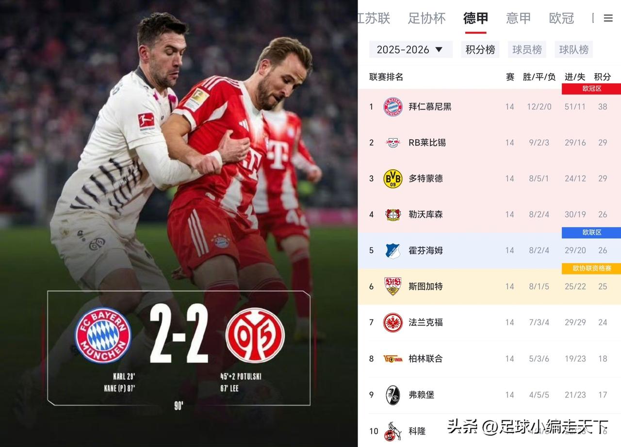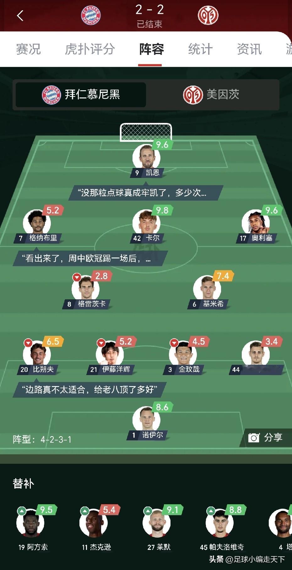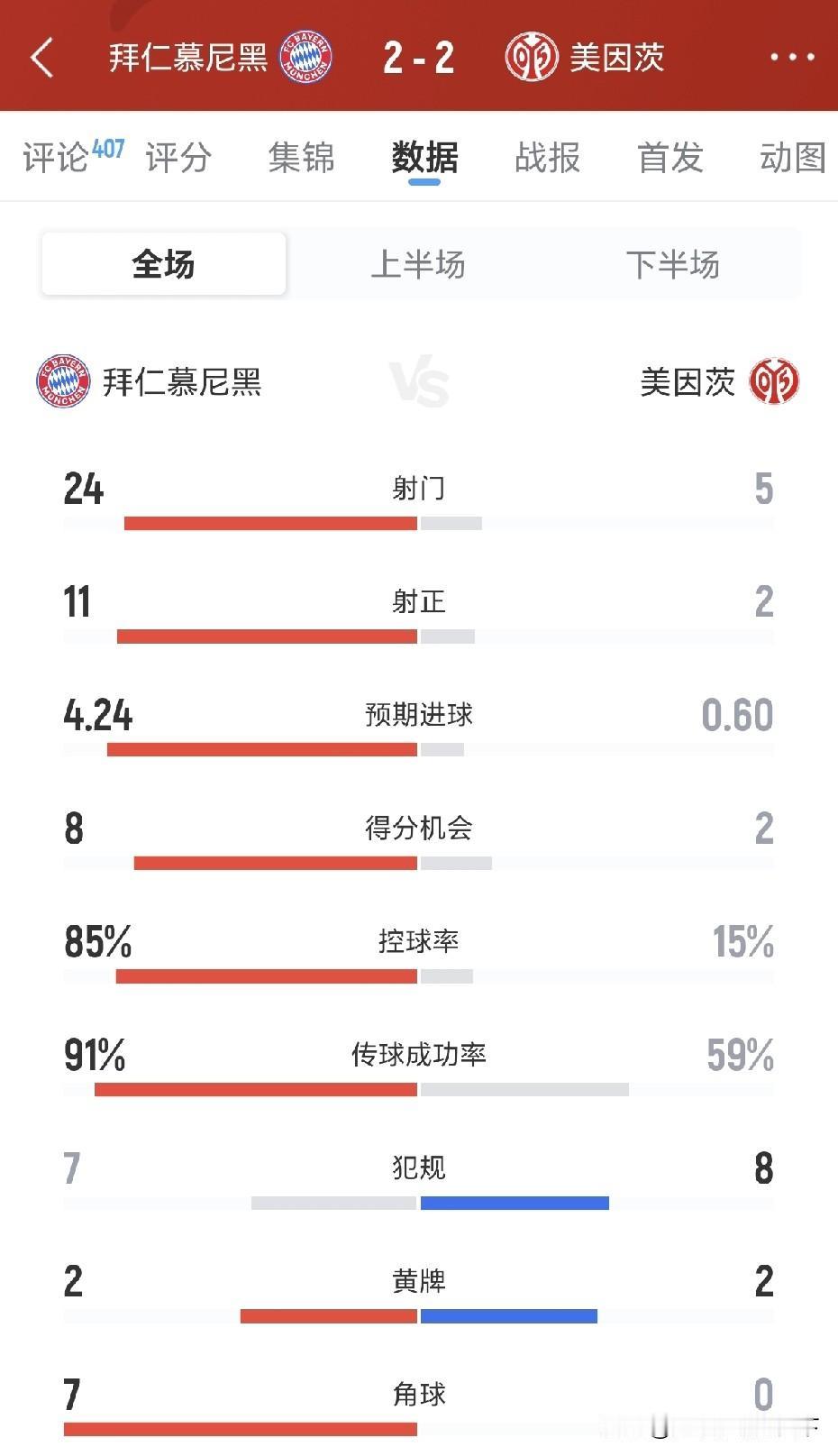 拜仁也是没谁了,85%控球率居然没赢球,美因茨只有15%的控球率,2次射正,2:2平,这效率…… 不过最关键的是,拜仁这轮平了,积分榜分差还拉大了,你说找谁说理去。[捂脸] 其实这场是妥妥的系统局,不过仔细想想美因茨当年帮助过拜仁狙击过多特,助拜仁拿了冠军,这一轮二三名都没赢,美因茨倒数第一,拜仁送一分给美因茨很正常。[奸笑] 其实说白了拜仁在德甲联赛和杯赛和大巴黎一样没啥压力,就是以赛代练,随便踢踢。主要精力还是全力征战欧冠。这比西甲双雄、和英超、意甲的争冠球队们有太多的体能消耗优势了。