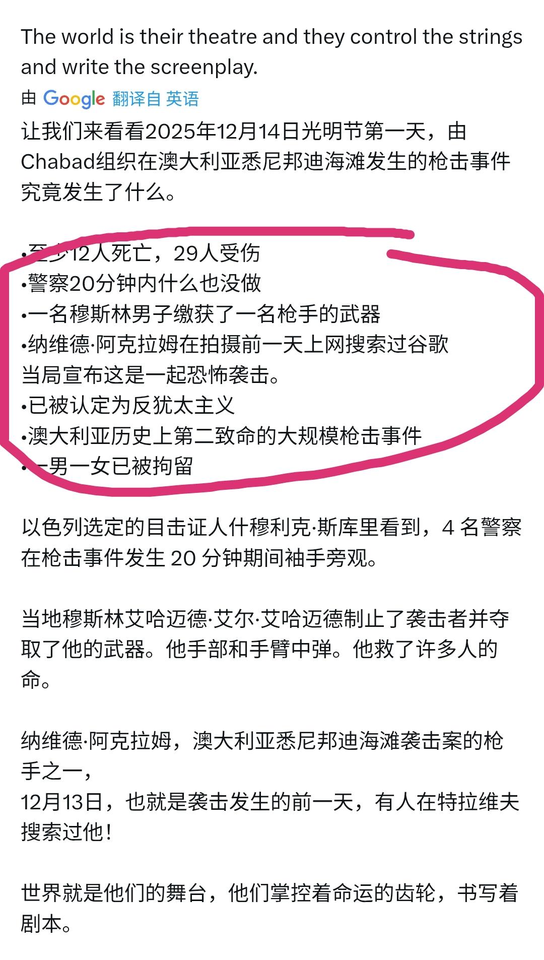 澳大利亚海滩枪击事件16人死亡,已经被定性为恐怖主义,反犹太主义,而且20分钟内警察毫无作为。 我们换个角度来看这件事。 宗教和种族冲突+枪支泛滥=野蛮。 在原始社会,部落与部落之间的冲突就是这样发生的,因为信仰不同,种族不同,武器拥有不受人为控制,原始人之间的冲突时有发生。 而文明则是对不同种族宗教的包容融合和接纳,对武器的控制性使用。 以这样的标准来看,只有中国才是这个世界唯一的文明国家。其他都还处于野蛮向文明进化的过程中。 所以,凡是希望中国社会向西方演化的人本质上都是希望中国由文明社会向野蛮演化。而他们却偏偏把这叫作向文明靠近。这是真正的反人类。 点右上角关注我,我们一起去看这个魔幻的世界