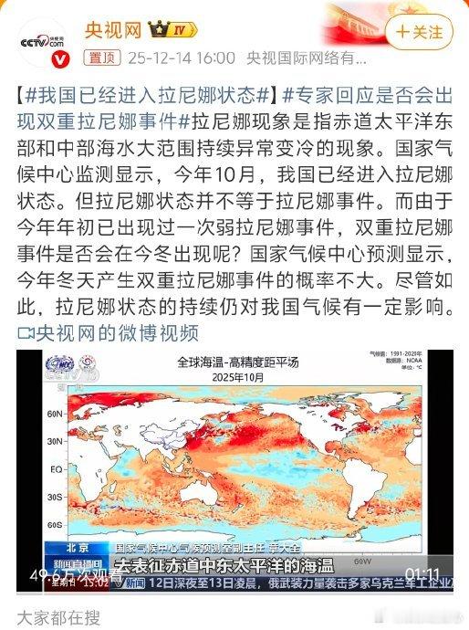 我国已经进入拉尼娜状态各位小伙伴们!最近有个气候界的 “大明星” 登场啦,那就是拉尼娜。我国已经进入拉尼娜状态,这可不是一件小事,它就像一颗投入平静湖面的大石头,会在气候的 “湖面” 上掀起不小的波澜。拉尼娜现象,简单来说,就是赤道中东太平洋海表温度异常出现大范围偏冷、且强度和持续时间达到一定条件的冷水现象。这听起来好像就是海水变冷了点,没啥大不了的,但实际上它对全球气候都有着深远的影响。从历史数据来看,拉尼娜出现时,我国冬季气温往往会偏低。就拿过去几次拉尼娜事件来说,很多地区都经历了比常年更寒冷的冬天。有专家指出,拉尼娜事件发生当年的冬季,我国中东部大部地区气温往往比常年同期偏低。这意味着什么呢?意味着我们可能要面对更凛冽的寒风、更厚的积雪。想象一下,早上起床拉开窗帘,外面一片银白世界,水管可能被冻住,出门得裹成个 “粽子”,这就是拉尼娜可能带来的寒冷现实。不过,拉尼娜带来的可不仅仅是寒冷。它还可能影响降水分布。在拉尼娜年份,我国南方地区可能会出现降水偏少的情况,而北方地区降水可能会有所增加。这就可能导致南方一些地区面临干旱的威胁,农田缺水,农作物生长受到影响;而北方则可能遭遇更多的降雪和冰冻天气,给交通、能源供应等方面带来挑战。面对拉尼娜,我们可不能坐以待毙。对于普通老百姓来说,要提前做好防寒保暖措施,准备好厚棉衣、围巾、手套等保暖用品,家里可以备上一些暖手宝、热水袋。在饮食上,多吃一些温热的食物,增强身体的抗寒能力。对于农业部门来说,要提前做好农作物的防寒抗冻工作,比如给农作物覆盖地膜、熏烟增温等。交通部门也要提前做好应对冰雪天气的准备,储备好融雪剂,加强道路的巡查和维护。拉尼娜状态的到来,就像是大自然给我们出的一道难题。虽然它会带来一些挑战,但只要我们提前了解、积极应对,就一定能够安然度过。让我们一起做好准备,迎接这个可能寒冷的冬天,相信我们有足够的智慧和能力战胜拉尼娜带来的影响。在这个过程中,大家都要照顾好自己,和家人朋友一起温暖地度过这个特殊的时期。我国进入拉尼娜状态,这一现象会使冬季气温偏低、影响降水分布,给我们带来寒冷、干旱、降雪等多方面的挑战。但我们无需过度担忧,无论是个人还是各个部门,只要提前做好应对措施,就能有效降低拉尼娜带来的不利影响,以积极乐观的心态迎接这个可能不寻常的冬天。