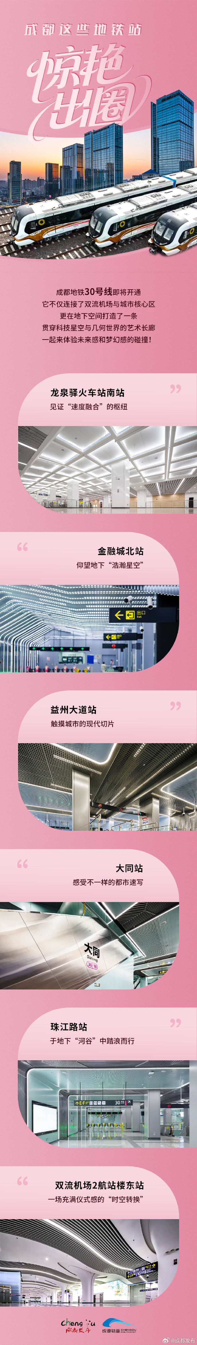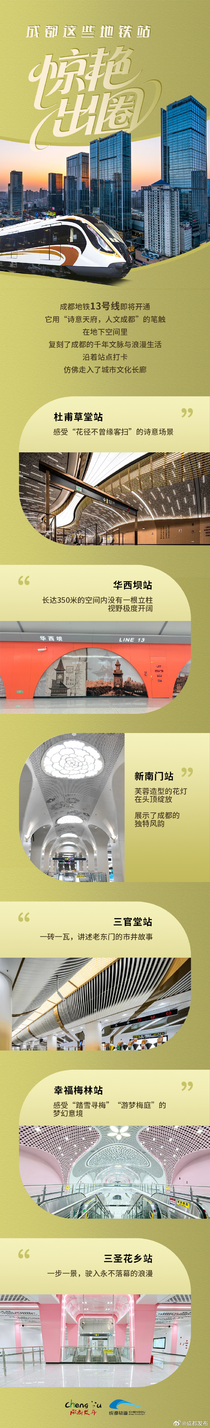 【官宣开通!#成都这些地铁站惊艳出圈#】今日,成都轨道集团官宣轨道交通13号线一期、30号线一期将于明日开通初期运营。新线的开通除了带动通勤效率的进一步提升,两条新线还打造了一批特色鲜明的车站,美学设计拉满。如13号线幸福梅林站以梅花为设计元素,营造“游梦梅庭” 氛围;30号线金融城北站以灵动线条勾勒数字金融科技感,打造地下”浩瀚星空“。新开两条线路还有哪些特色站点?一起来逛↓