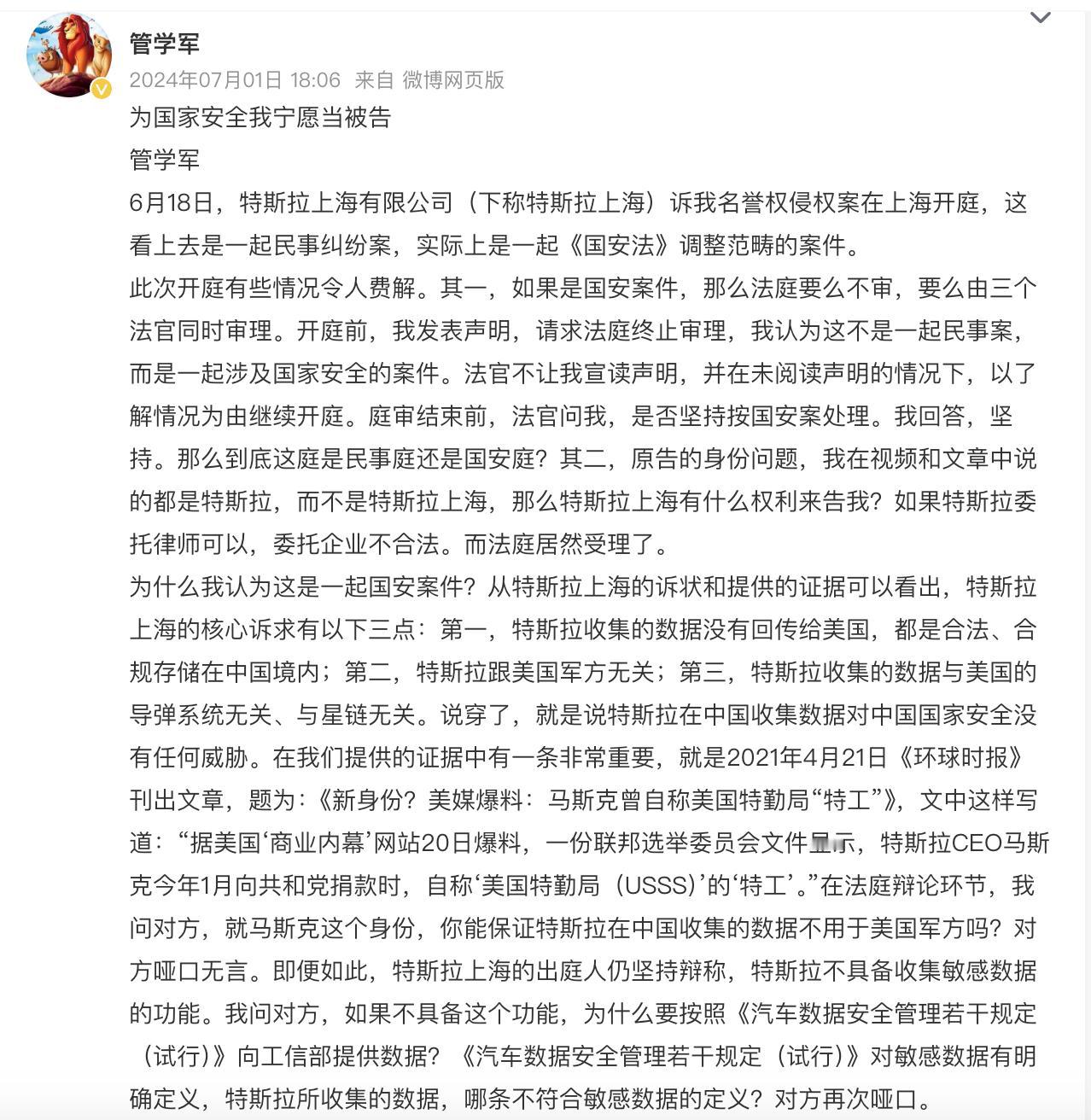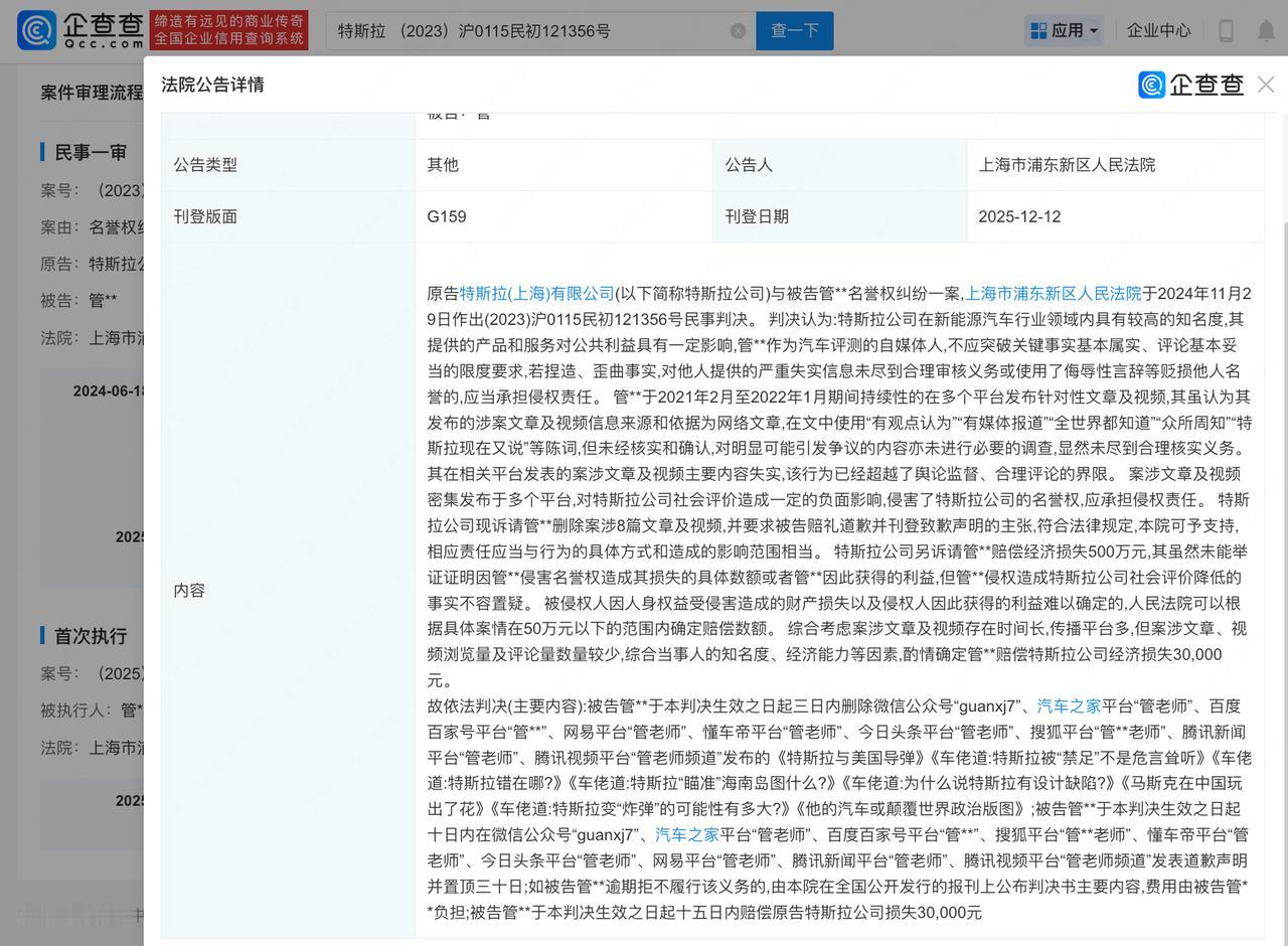 【自媒体管学军判赔特斯拉3万元】特斯拉告选车网总裁胜诉企查查APP显示,12月12日,法院公告特斯拉(上海)有限公司与管学军名誉权纠纷一案。 法院判决认为,被告于2021年2月至2022年1月期间持续性的在相关平台发表的案涉文章及视频主要内容失实,原告诉请删除案涉8篇文章及视频,并要求被告赔礼道歉,另诉请被告赔偿经济损失500万元。法院综合当事人的知名度、经济能力等因素,酌情确定被告赔偿3万元。故依法判决,被告删除多平台多篇文章;在相关账号发表道歉声明并置顶三十日;赔偿原告特斯拉损失3万元。 据此前媒体报道,案件被告为选车网总裁,查询主页发现该账号曾于案件开庭后发表“为国家安全我宁愿当被告”内容,目前该账号因违反相关法律法规,已处于禁言状态。