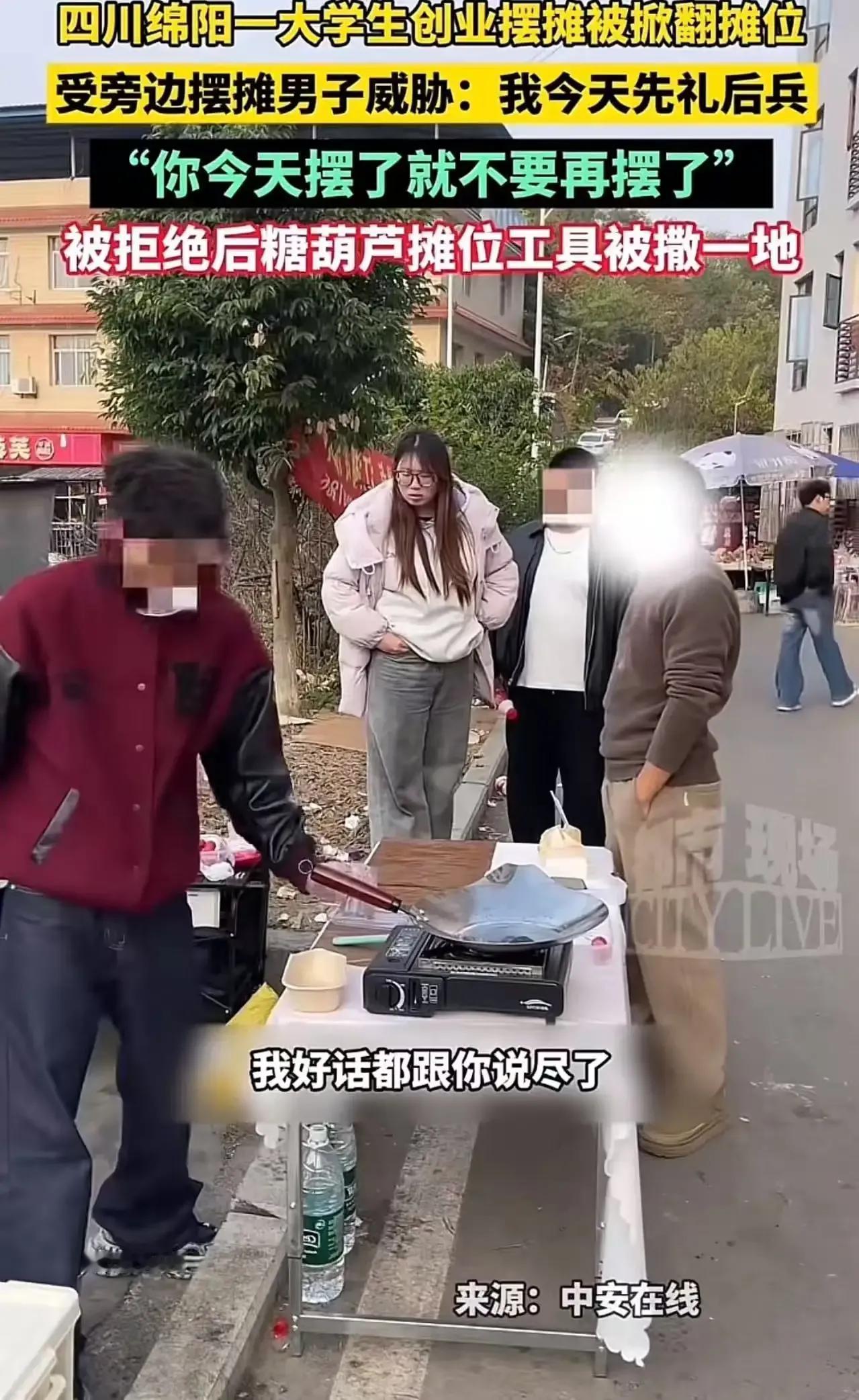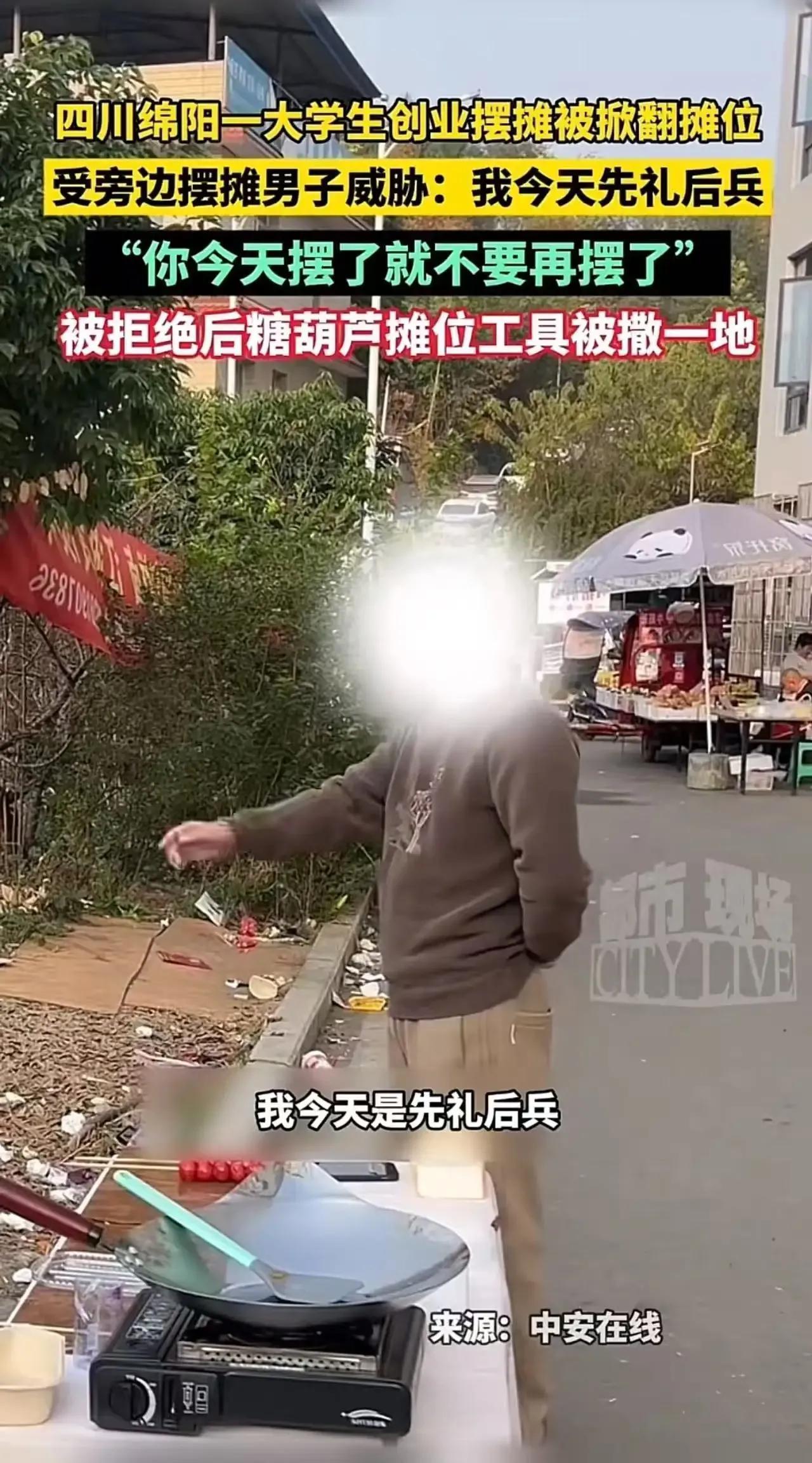 大学创业摆摊被掀摊位,还敢在校园周边当地霸?四川绵阳一大学生就遭遇了这样的事,旁边摆摊男子竟直接掀翻他的摊位,双方扭打在一起,这究竟是怎么一回事? 据了解,这位大学生利用课余时间摆摊创业,本想锻炼自己、赚点零花钱,没想到却遇到了这样的麻烦。旁边摆摊的男子,不知出于何种原因,突然上前掀翻了他的摊位,还恶语相向。大学生年轻气盛,哪能受得了这种欺负,于是冲上去和男子扭打在一起。这一幕被路人拍下,迅速在网络上引发热议。网友们纷纷表示,这世界最大的恶,就是底层人欺负底层人。大家都是为了生活奔波,何必互相为难呢?更有网友指出,这种行为不仅损害了大学生的创业热情,也破坏了社会的和谐氛围。我们不禁要问,难道真的只有通过暴力才能解决问题吗?在法治社会,我们应该用法律武器来维护自己的权益,而不是以暴制暴。 这起事件再次提醒我们,尊重他人就是尊重自己,底层人之间更应互相扶持,而不是互相伤害。对于这起事件,你有什么看法呢?快来评论区留言讨论吧!大学生创业 摆摊冲突 摆摊纠纷 大学城摆摊