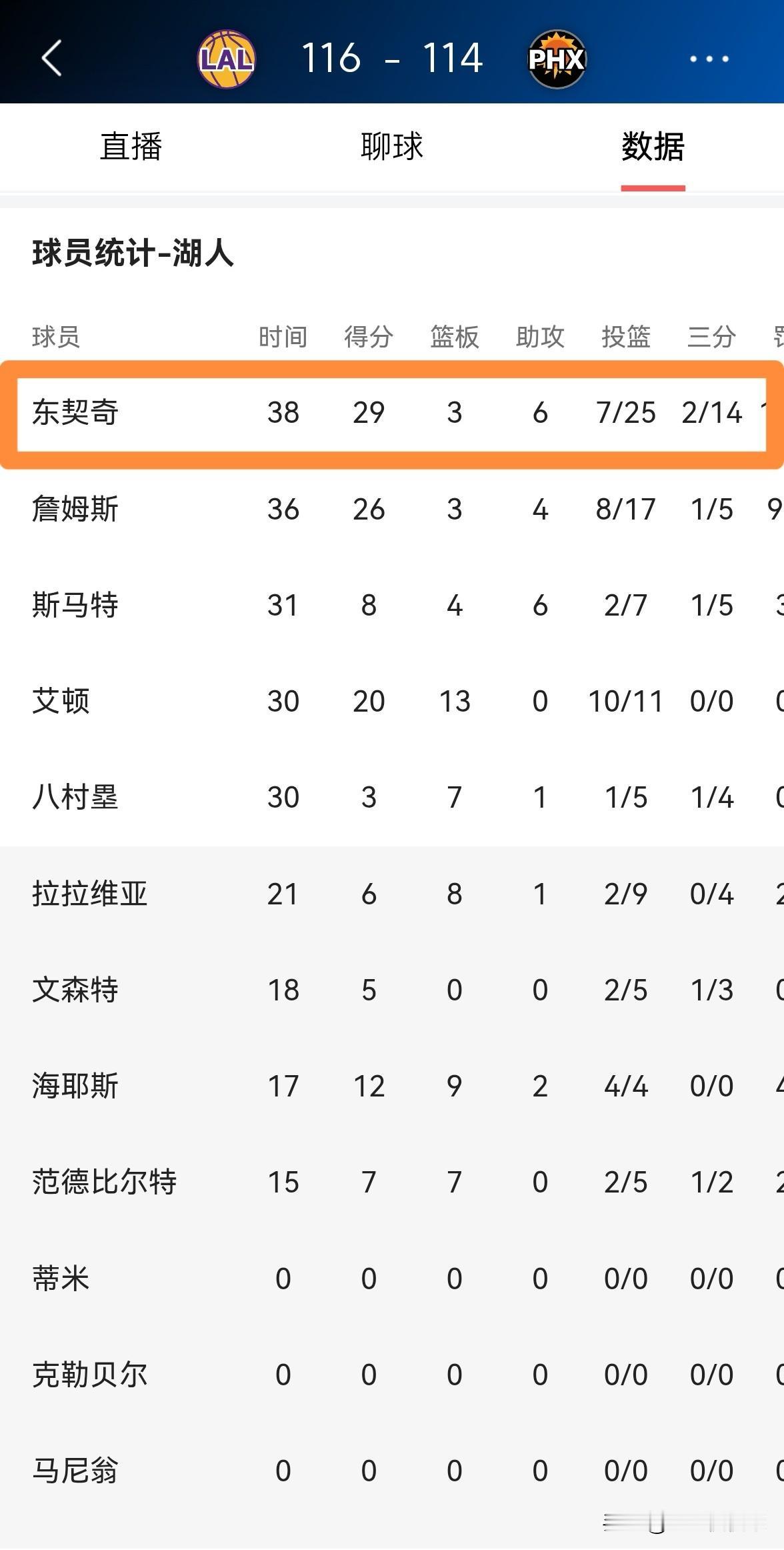 我忍不住要怒批湖人头号球星东契奇!今天湖人在客场以116:114险胜太阳,本场比赛东契奇在投篮手感糟糕的情况下依然选择浪投,险些导致球队输球。 整场比赛下来,东契奇首发出战38分钟,投篮25中7,其中三分球14中2、罚球14中13极其低效的得到29分,还出现了6次失误,他的场上正负值为-5。 作为球队的当家球星,东契奇在手感冰凉的情况下依然选择强投真是让人费解,我觉得东契奇永远成不了一名NBA历史级别的球星。