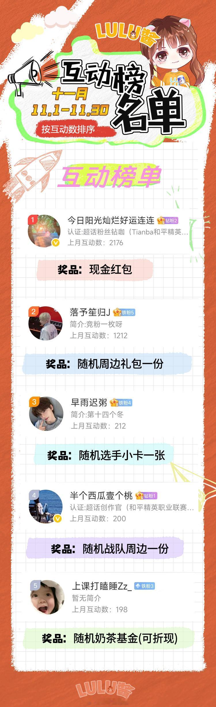 十一月互动榜来咯宝宝们快来私信路路酱哦和平精英职业联赛2025pel