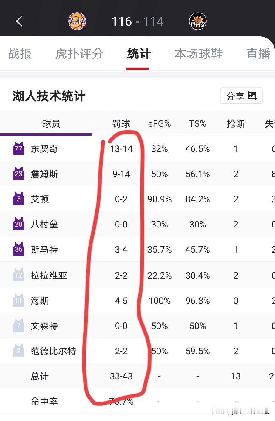 这比赛湖人是非赢不可吗? 要不说NBA是商业体育联盟天花板呢,要是CBA这样吹,估计要罢赛了。 东契奇14中2的3分球还有6失误,詹姆斯5中1的3分球还有8失误,湖人愣是靠着43次罚球赢了比赛,太阳上哪说理去?