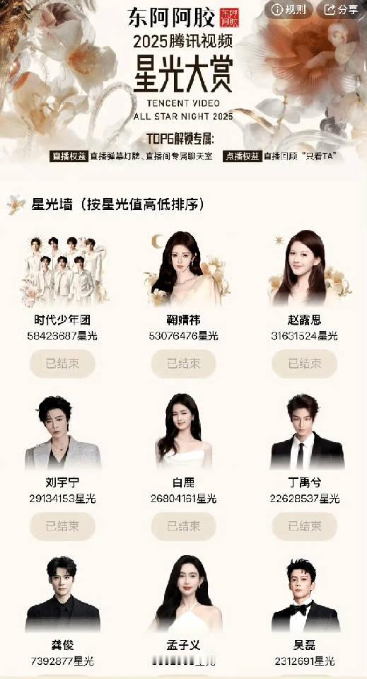 星光大赏投票,腾讯治水成功,时代少年团超越鞠婧祎成为第一,赵露思,刘宇宁,白鹿,丁禹兮分列3-6位。