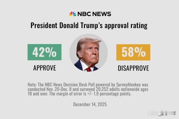 【民调:坚定支持特朗普的比例,从 4 月的 26% 下降到 12 月的 21%】 NBC News Decision Desk的民调显示,即便是在最忠实的“MAGA”支持者中,对特朗普及其政府的支持率也在下降。 根据民调结果: -- 58% 的美国人不认可特朗普在总统任内的表现, -- 42% 的人认可他的表现。 自 2025 年 4 月以来,支持率下降了 3 个百分点。 民调还显示: -- 坚定支持特朗普的比例,从 4 月的 26% 下降到 12 月的 21%; -- 同时,坚定不支持总统的比例,从 42% 上升到 44%。 最明显的变化出现在共和党人,尤其是“MAGA 运动”支持者中: - 在共和党人中,坚定支持特朗普的比例从 38% 降至 35%; - 在 MAGA 支持者中,虽然仍有 70% 支持他,但相比 4 月也下降了 8 个百分点。 共和党内部的力量对比也发生了变化: -- 春季时,多数共和党人自称是 MAGA 运动的一部分; -- 现在,党内几乎平均分成两派: -- 一派是 MAGA 支持者, -- 另一派则称自己更偏向传统共和党人。 大多数受访者认为,国家正走在错误的方向上,经济被视为最大的问题。 美国人的评价受到生活成本上涨的影响——从日常食品购物到节日支出。 而“改善经济”正是特朗普在竞选期间的核心承诺之一。 此外,特朗普在“爱泼斯坦案”上的含糊立场,也对其支持率下滑产生了影响。 本次民调于 11 月 20 日至 12 月 8 日以线上方式进行,调查对象约为 2 万名美国成年人,误差幅度约为 ±1.9%。