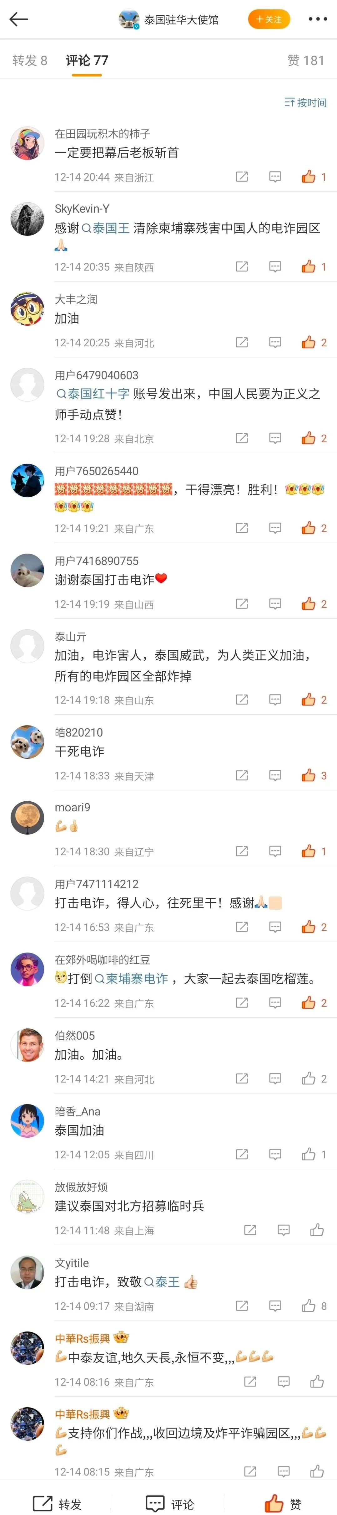 泰国驻华使馆评论区被“攻占”,网友花式打气太逗了! 刷微博笑不活了!泰国驻华使馆评论区被网友“攻占”,全是给泰国加油打气的,画面超喜感[允悲]。 核心原因还是柬埔寨电诈太猖獗,游客怕踩坑,泰国旅游也受牵连。网友直接放话:泰军端了电诈园区,明年就带全家去泰国玩!这波绑定虽直接,却藏着大家对安全旅游的期待。 泰国旅游资源棒、物价友好,要是真能联手解决电诈,重拾游客信任,肯定能再成热门。就是打击电诈得多国联动,没那么容易。泰国能搞定电诈,你会去玩吗?