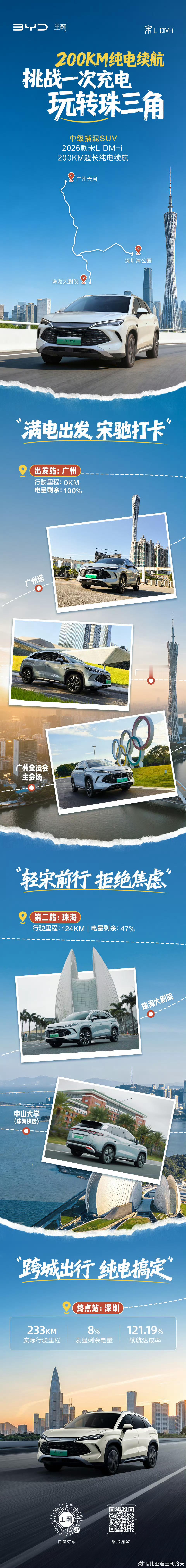 广州-珠海-深圳,有媒体开着我们的中级插混SUV2026款宋L DM-i ,完成了一场全程「只用电」的打卡!这无需规划、说走就走的三城畅游,正是宋L DM-i 200km纯电续航为用户带来的自由刻度。我们所追求的,不仅是续航数字的增长,更是一种生活方式的温柔拓展,为用户带来无限、自由的出行选择。