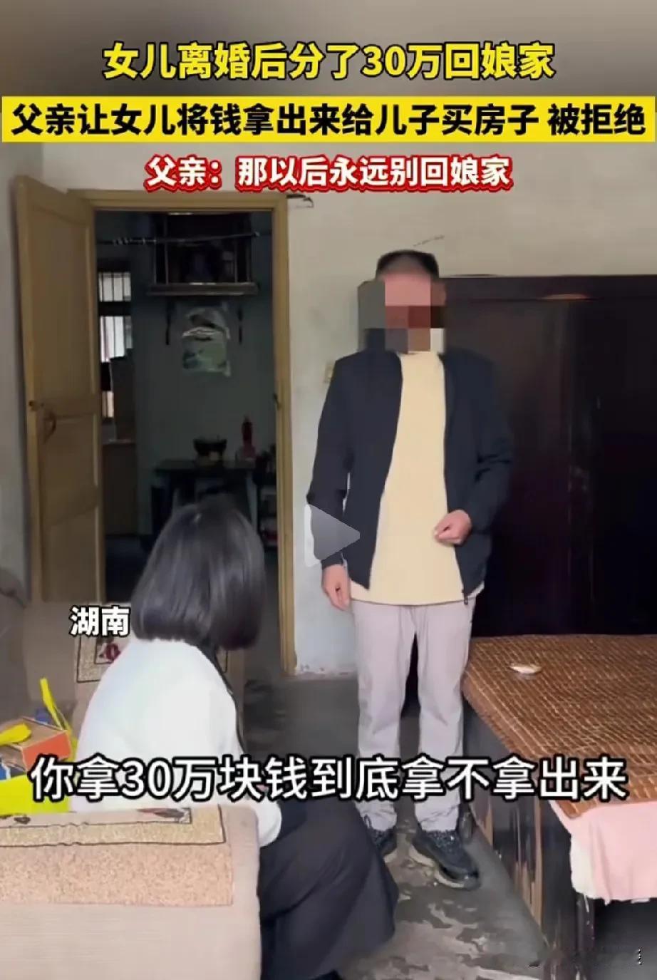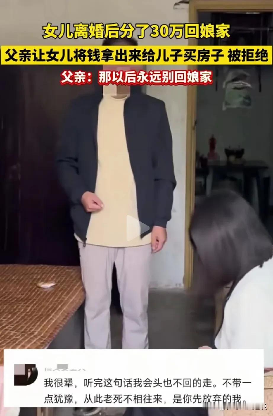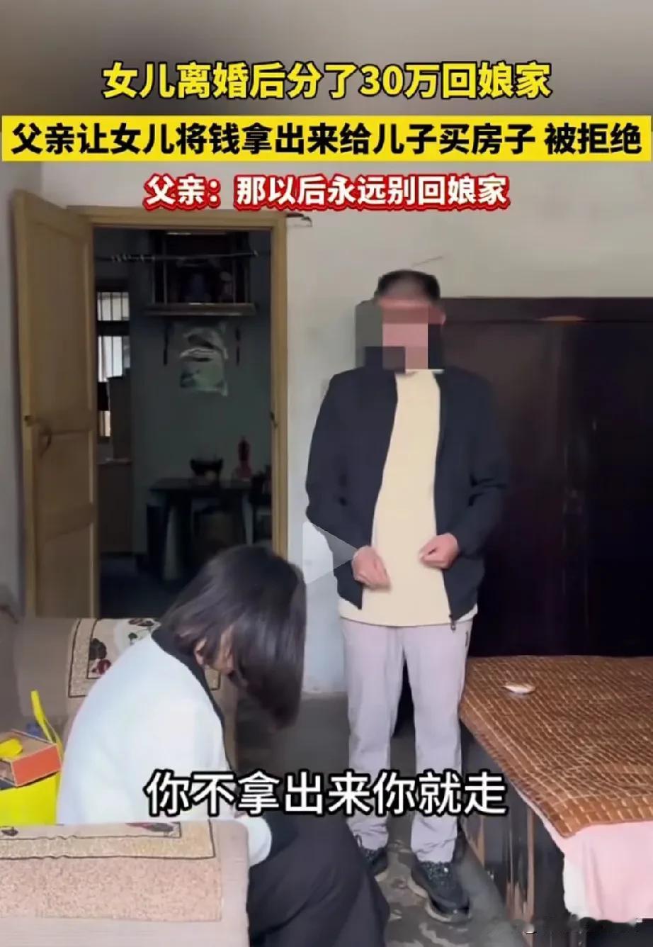 从来没有见过这么绝情的父亲。女子离婚后分了30万,回到娘家那边,他爸爸就想把这些💰拿出来给她弟弟买房子用。女子说这是她牺牲家庭和爱情得到的💰,作为自己的私房钱,不想拿出来。她父亲就威胁她,不拿出来就不要在这个家了,永远不要回来。 很多网友说这个父亲贪婪绝情,女儿刚离婚,不心疼女儿,还想把女儿仅有的私房钱要过来。女子直接走,用这些钱买套一居室,找个工作,养活自己没问题。要是给了她的父亲,到时候也会被弟弟媳妇撵出去,到时候啥也没有。不如趁早拒绝。