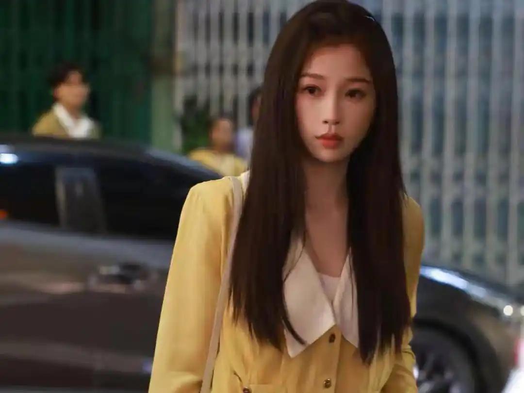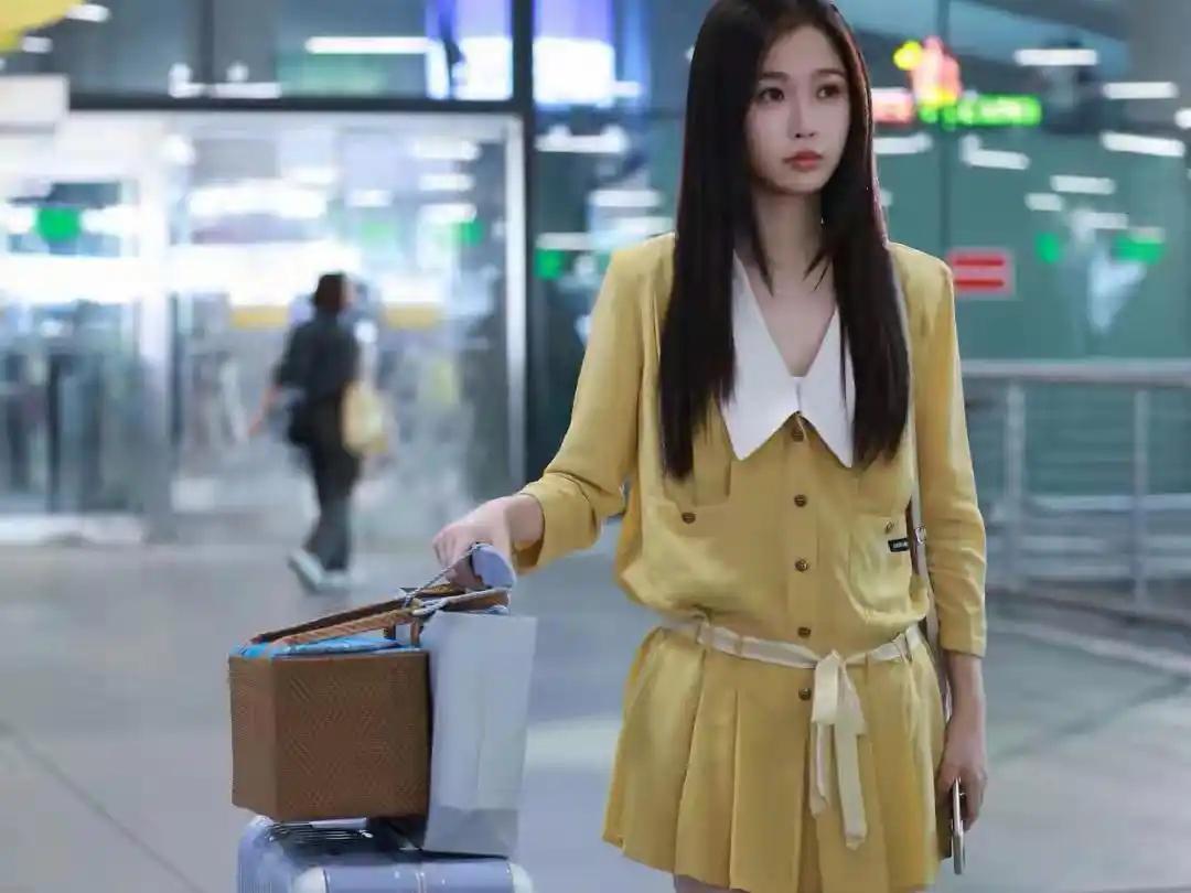 虞书欣最新机场路透照,穿淡黄色连衣裙,大长腿又白又嫩好抢镜