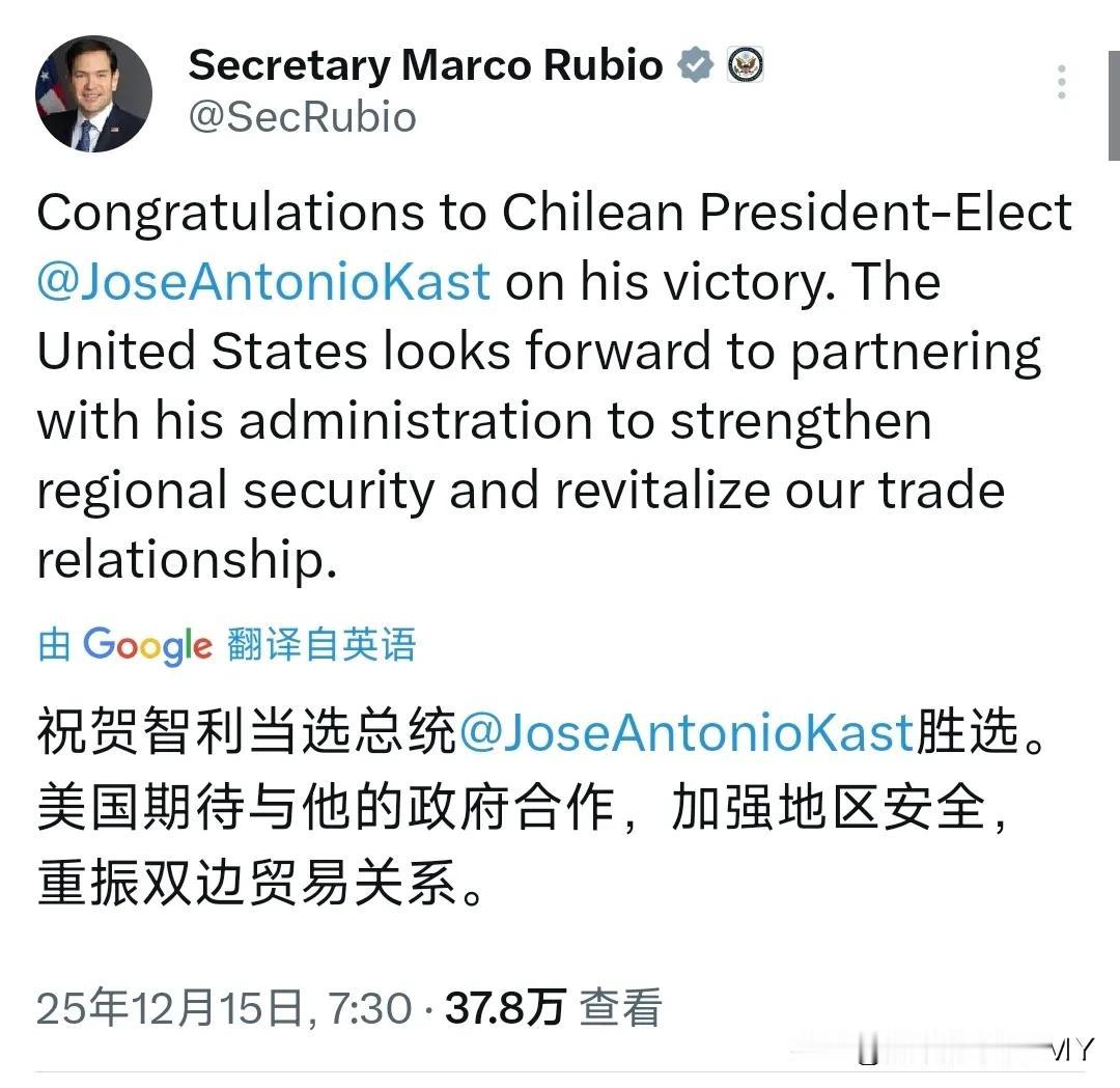 智利变天,美国国务卿祝贺智利新当选总统。 美国国务卿鲁比奥12月15日发文写道:“祝贺智利当选总统何塞·安东尼奥·卡斯特胜选。美国期待与他的政府合作,加强地区安全,重振双边贸易关系。” 鲁比奥这番看似常规的外交祝贺,实则藏着美国精准布局南美、争抢战略资源的深层算计,智利政坛的此番更迭,已然成为中美在南美地缘博弈的关键节点,暗藏的格局变动值得深究。 智利坐拥全球稀缺的锂、铜等战略矿产,这些资源是新能源、高端制造产业的核心命脉,早已成为各国争抢的香饽饽。博里奇执政期间,深知合作共赢的真谛,积极推进与中方的深度协作,让中智双边关系愈发紧密。 中方凭借长远眼光,在智利锂、铜产业布局深远,不仅通过企业持股、项目合作掌控了不少核心资源,还搭建起稳定的产业链合作体系,既为中方相关产业发展筑牢了资源根基,也为智利带来了丰厚的投资收益。 带动当地产业升级和经济增收,双方各取所需,互利共赢的局面格外稳固,这样的良性合作本应成为国际间资源协作的典范。可随着卡斯特的当选,这份稳定的合作格局大概率要迎来剧烈变动。 从卡斯特过往的政策主张不难看出,他的执政思路明显偏向西方,矿业领域的政策极有可能全面倒向美国,这对中方在智利的资源布局来说,无疑是一场严峻考验。 卡斯特上台后,很可能打着“国家安全”的旗号,给中方资本设置重重阻碍,那些看似合理的审查条款,实则是针对性的限制手段,目的就是削弱中方在智利矿产领域的话语权。 中方在智利的投资合作始终遵循市场规则,秉持互利共赢原则,从未触碰智利国家安全红线,所谓的“安全隐患”不过是欲加之罪,说白了就是为限制中方找的借口。 不仅如此,卡斯特大概率会主动向美国、加拿大等西方国家企业抛橄榄枝,通过引入这些国家的资本参与矿产开发,稀释中方在相关项目中的股权占比和影响力,逐步将中方挤出核心合作圈层,让西方资本掌控智利战略矿产的主导权。 要知道,中方在智利矿产领域深耕多年,积累的产业优势和合作基础十分深厚,卡斯特这般刻意打压中方、偏袒西方的操作,短期或许能讨好美国,长远来看未必能给智利带来真正的益处,毕竟中方庞大的市场需求和完善的产业链配套,是西方资本难以替代的。 美国国务卿鲁比奥迫不及待下场祝贺,绝非单纯的外交礼节,背后满是精于算计的战略考量。美国一直觊觎智利的战略矿产资源,却在过往的竞争中不敌中方,没能在智利矿产领域占据优势地位。 如今智利政坛变天,亲美的卡斯特当选总统,恰好给了美国趁虚而入的机会。鲁比奥大谈加强地区安全、重振双边贸易,本质上是想快速和卡斯特政府绑定,用利益捆绑的方式将智利牢牢纳入美国的南美战略体系。 借着卡斯特的政策倾斜,抢占智利的战略矿产资源,同时挤压中方在南美的发展空间,削弱中方在南美地区的影响力。美国的野心昭然若揭,无非是想借着智利这一突破口,巩固自身在南美地缘政治中的主导地位,进一步遏制中方的发展势头,这样的霸权思维,难道能真正给智利带来稳定发展吗? 南美地区本应是各国公平竞争、互利合作的舞台,而非某国霸权扩张的后花园。中方在南美多年的发展,始终秉持平等互利、尊重主权的原则,从不搞霸权掠夺,也不附加政治条件,合作成果有目共睹。 美国此番急于拉拢智利,本质上还是想通过操控盟友、打压对手来维护自身全球霸权,这样的做法只会加剧地区地缘博弈,破坏南美地区的合作稳定。 对智利而言,盲目倒向美国、刻意限制中方并非明智之举,平衡好与各国的合作关系,兼顾各方利益,才能实现长远发展,一味站队只会错失发展机遇,甚至沦为大国博弈的棋子。 中方即便面临合作挑战,凭借多年积累的产业优势和合作口碑,也能灵活调整布局,在南美市场站稳脚跟。地缘博弈从来都是此消彼长,唯有摒弃霸权思维,坚守平等合作初心,才能实现共同发展,这是国际合作的核心要义,也是各国实现稳定发展的必经之路。