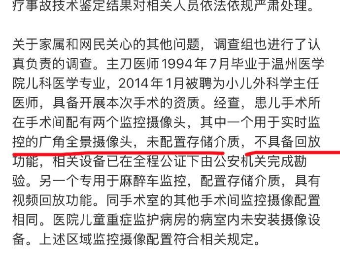 滑天下之大稽!三甲医院监控无回放,那装摄像头的意义在于摆设? 关注宁波妇儿医院患儿术后离世这事的都知道,医院一开始对家属的是没有监控,现在调查通告出来了又说有监控但没回放功能。那我想问一句,手术室装摄像头的意义究竟是什么?是为了装饰墙面,还是应付检查?没有回放、不能储存,这设备跟个摆设有什么区别? 更让人细思极恐的是,这么低级的设备漏洞,居然能在三甲医院合规存在?日常的设备巡检、质控管理难道都是一纸空文?再看涉事医生的处理结果:免去职务、暂停诊疗,连主刀医生姓名都藏着掖着。 监控成睁眼瞎,追责像走过场。所谓的合规,难道就是为事故发生后找借口铺路?这样的“合规”,对得起逝去的患儿,对得起满心信任医院的家长吗?但愿这不是最终调查结果,请有关部门继续彻查,给家属和公众一个满意的交代!
