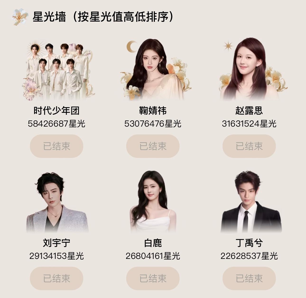 星光大赏专属镜头打投结束:时代少年团鞠婧祎赵露思刘宇宁白鹿丁