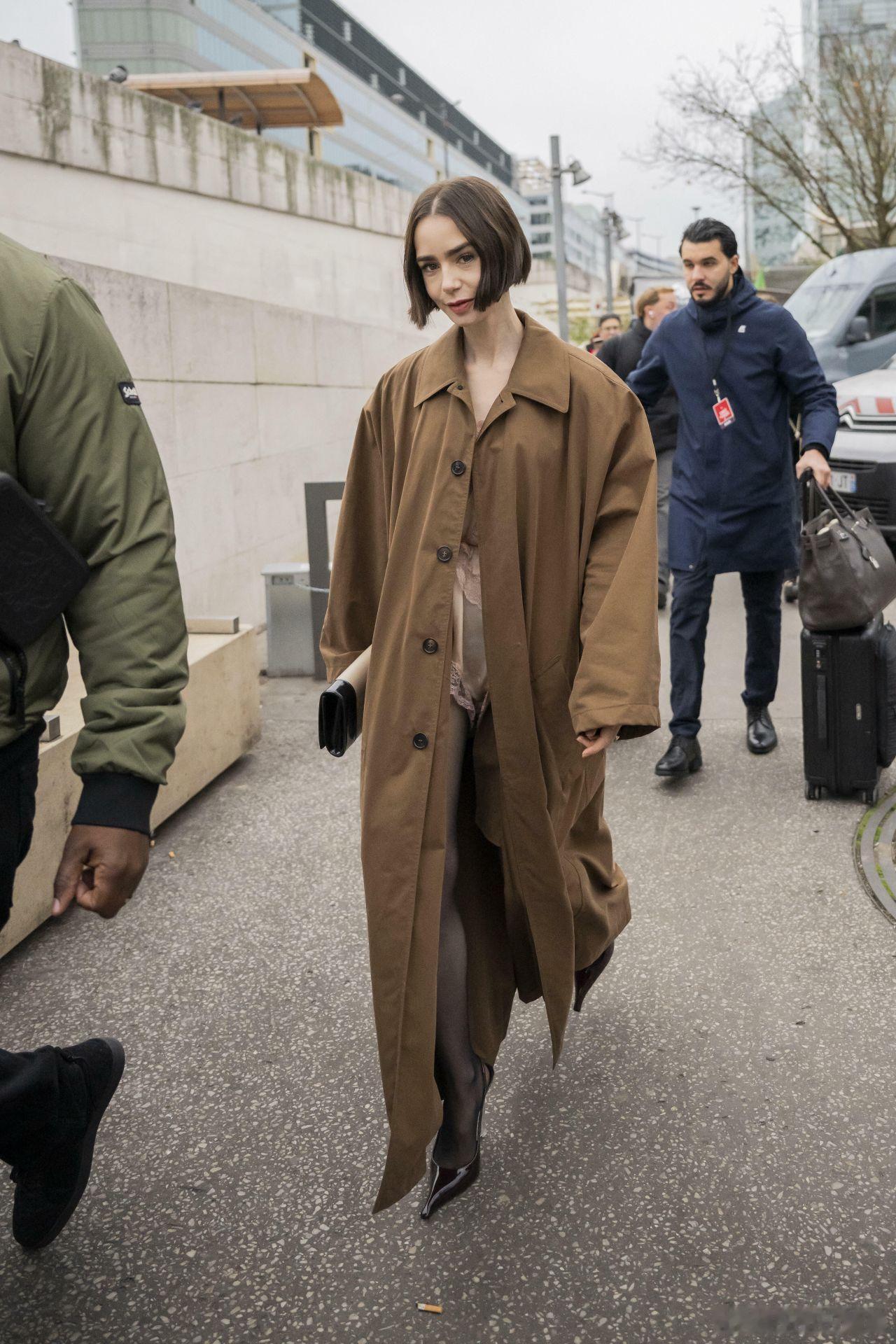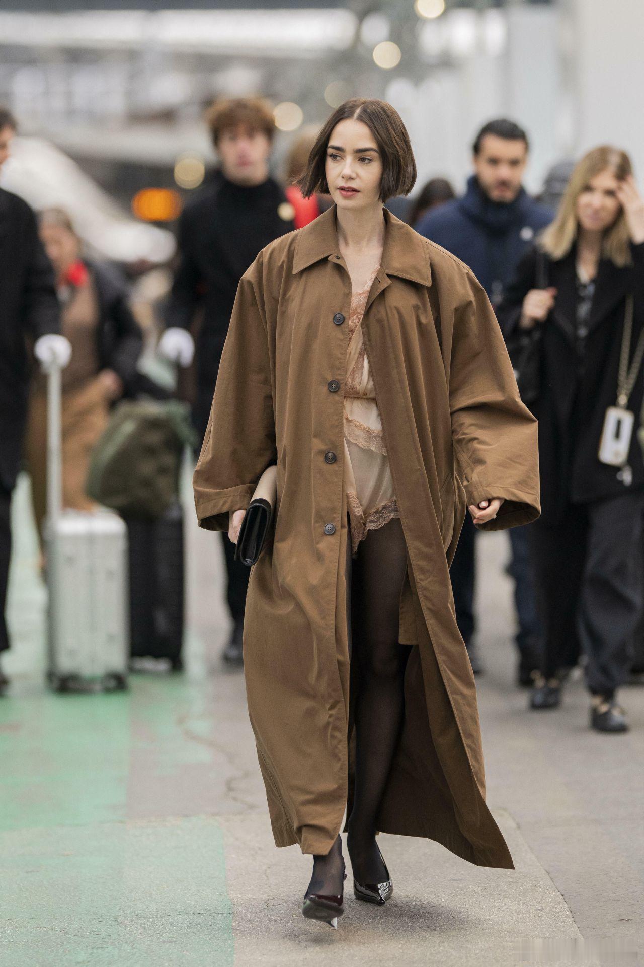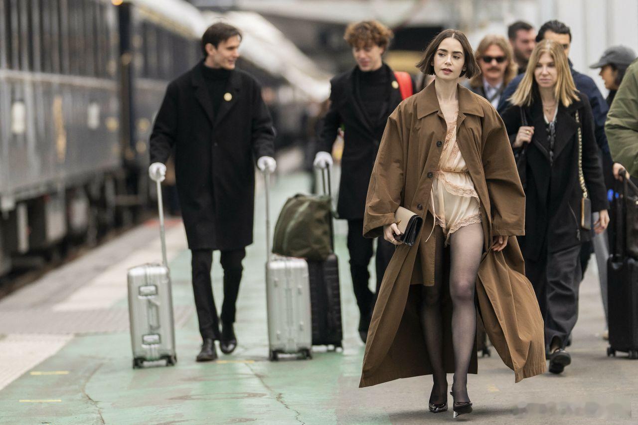 Lily Collins昨日和《艾米丽在巴黎》剧组出现在巴黎奥斯特里茨火车站,她穿了 Saint Laurent 的风衣内搭真丝雪纺连体衣,实用的外套与轻薄透明、镶有蕾丝边的内搭形成鲜明对比,这种刻意营造的张力既大胆又充满挑逗意味。时尚灵感解读