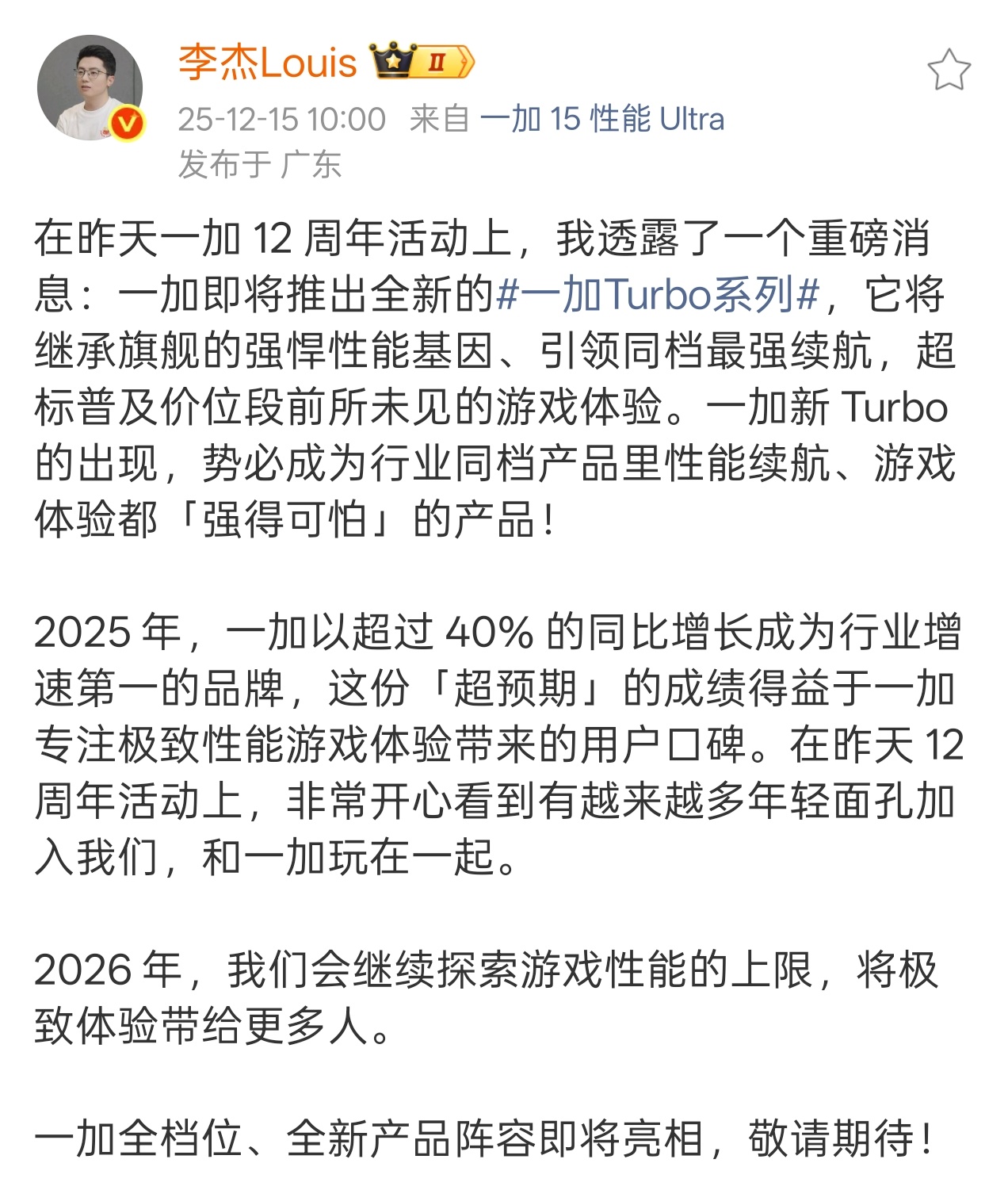 一加 Turbo 系列官宣,定位性能、续航、游戏体验。李杰还宣布,2025 年一加品牌同比增长超过 40%,行业增速第一。
