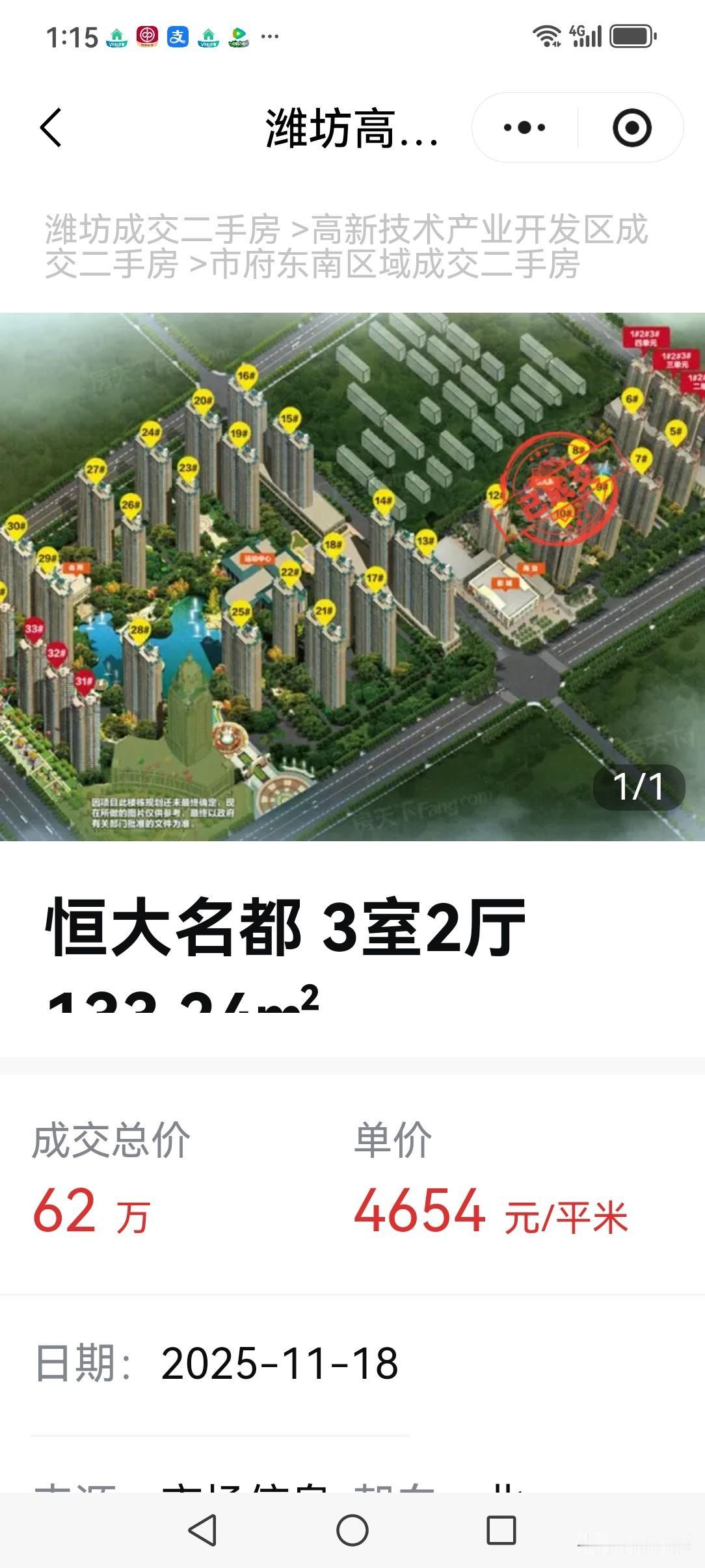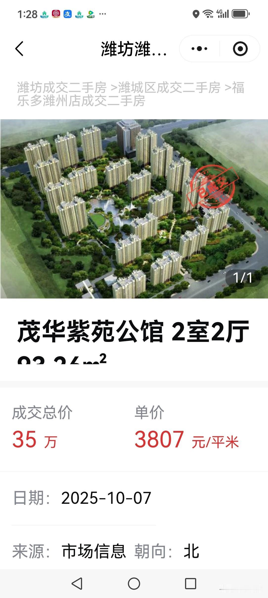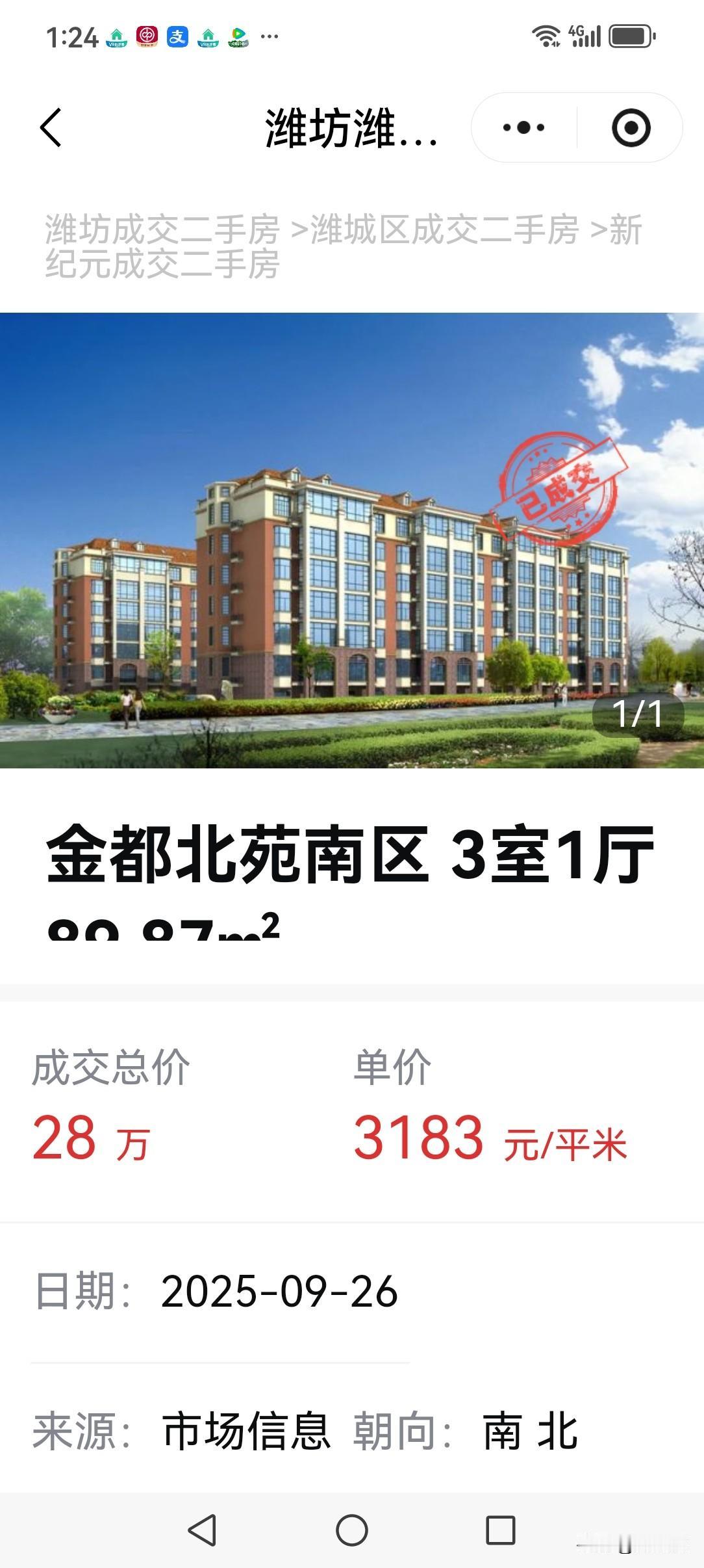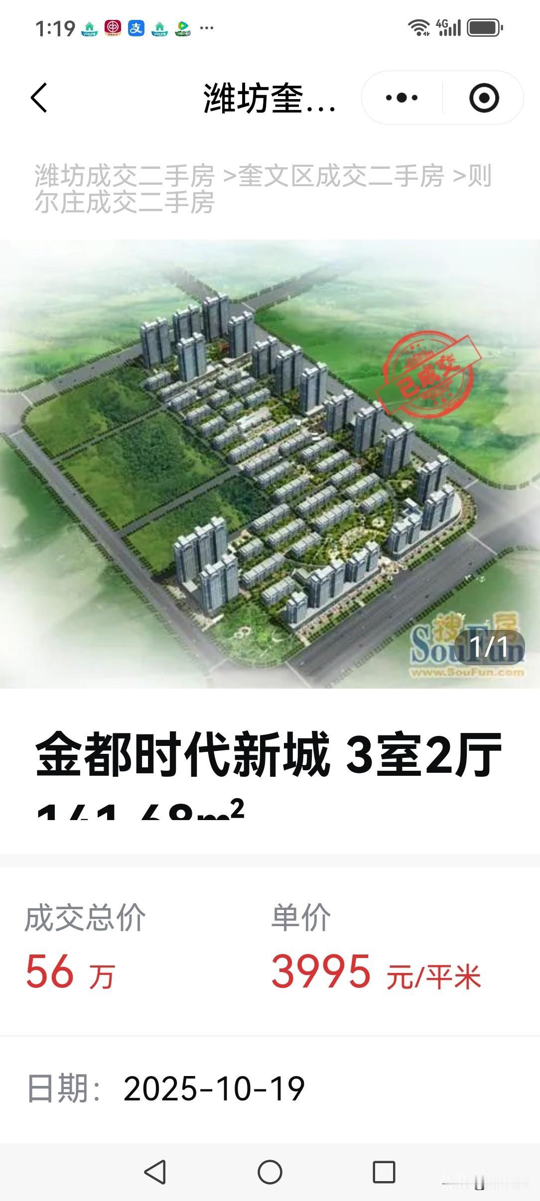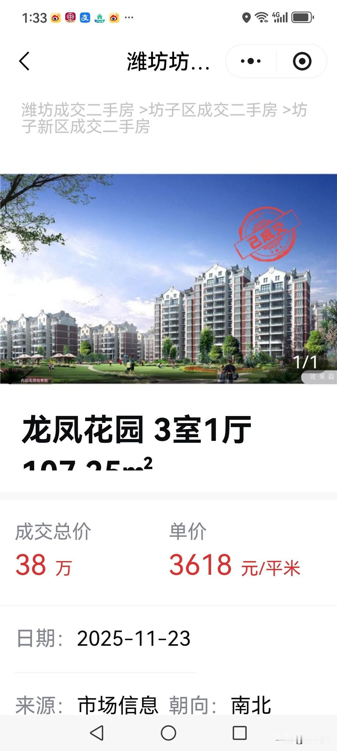现在的房价下跌已经回到了十几年前。 现在我们用数据说话,潍坊高新区的大观天下三期 2019年开盘,开盘价8700~9000一平方米。 20 25年大观天下三期11月20日118个平方成交价60万,5074一平方米。 [福][福][福][福][福][福][福] 高新区的恒大名都2018年开盘均价8300一平方米。 2025年恒大名都最新成交价133.24平方米,成交价62万,每平方米4654元。 [福][福][福][福][福][福][福] 奎文区的金都时代新城。 2015年时代新城开盘均价4500一平方。 2025年11月份,金都时代新城141.68平方米成交价 56万,每平方米3995元。 [福][福][福][福][福][福][福] 潍城区的金都北苑。 2015年金都北苑开盘均价4500元每平方。 2025年11月份金都北苑89.97平方米成交价28万, 每平方米3183元。 [福][福][福][福][福][福][福] 潍城区的茂华紫苑公馆 2012年开盘均价4500每平方。 2025年10月份茂华紫苑公馆93平方成交价35万,每平方米3803元。 [福][福][福][福][福][福][福] 坊子新区的龙凤花园2015年开盘均价4600元每平方米。 坊子新区龙凤花园2025年最新成交价107.35平方米成交价38万,每平方3618元。
