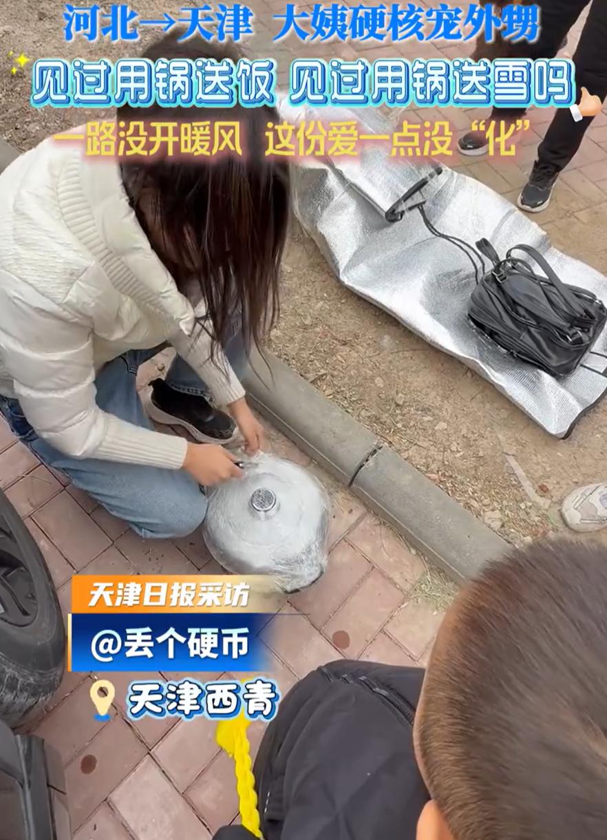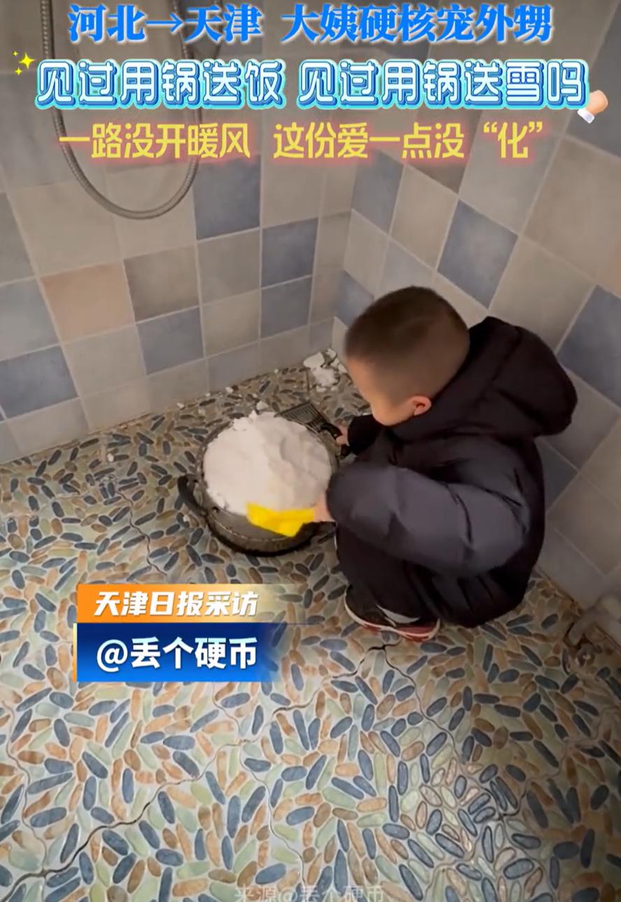 “这大姨能处!”天津,一女子家中孩子想要玩雪,好不容易盼来了下雪,结果所在的地方下的很小,外地的大姨得知后,直接驱车300多公里把河北的雪给外甥带了过来,怕雪花掉,甚至一路连空调都没开。网友:这份爱一点没化,真是一群不扫兴的大人! 据孩子的妈妈介绍,他们住在西青区,看了天气预报要下雪,孩子每天都特别期待玩雪,结果外地大雪纷飞,他们住的地方雪却很小,基本落地就花掉了,孩子根本体验不到玩雪的快乐 孩子的大姨在河北衡水,知道这个情况后,她特意找了个干净地方,一捧一捧装满了这口锅。为了不让雪在路上化掉,她里三层外三层包好,三百多公里的路程,车里愣是没开暖风,就这么一路冷着开过来了 孩子看到这锅雪,眼睛一下子亮了,小手伸进去摸了摸,凉丝丝的,是真的雪。他开心地跳起来,在屋里就迫不及待想玩。妈妈赶紧找来小桶和小铲子,让孩子在阳台上堆起了迷你雪人。虽然雪不多,只够堆一个小小的,但孩子笑得特别开心 这件事的特别之处,不在于开了多远的车,而在于心意和执行力。成年人总觉得孩子玩玩雪就是小事,但对孩子来说,这是一种完整的体验,一种记忆。大人如果能注意到孩子的感受,并为他们创造条件,就能让这些瞬间成为孩子童年里特别的回忆 这也不禁让人想起自己生命里那些“不扫兴”的大人。或许是小时候非要带你去某个地方玩的舅舅,或许是偷偷多给你塞零花钱的奶奶,或许是在父母责备你时站出来替你说话的姥姥。他们用自己或许并不“高明”的方式,笨拙地守护着孩子的快乐和天真 孩子的世界很简单,一场雪就能带来巨大的快乐。大人的世界有时很复杂,但愿意为你守护这份简单的人,一定很爱你