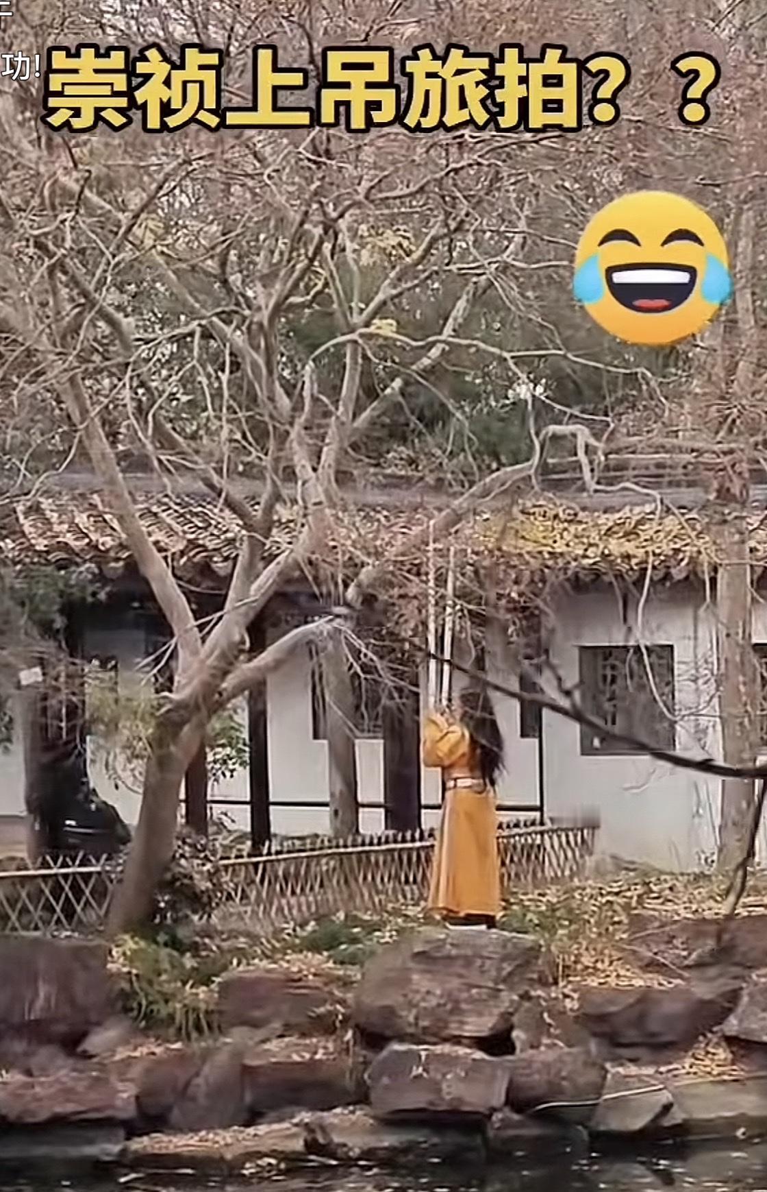 哈哈哈哈,哎我去,现代人的思维太超前了,居然开发出了崇祯皇帝上吊旅拍写真?!你这……都把我干蒙圈了!话说这个树看着也不像是景山那颗脖树啊?!而且树枝很细,后面还有水,大冬天的,你们务必当心别摔了![捂脸][捂脸][捂脸]崇祯皇帝之死