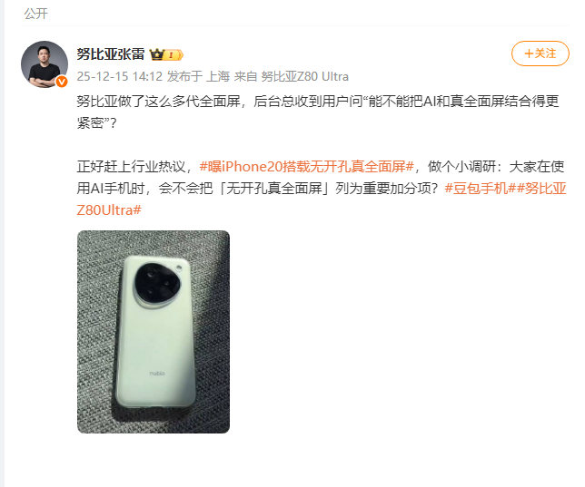 曝iPhone20搭载无开孔真全面屏iPhone的进度确实慢,目前努比亚Z80Ultra 已经有很成熟的无孔真全面屏,显示效果和自拍体验都不错,苹果得加快进度,希望早点见到真全面屏的iPhone20。